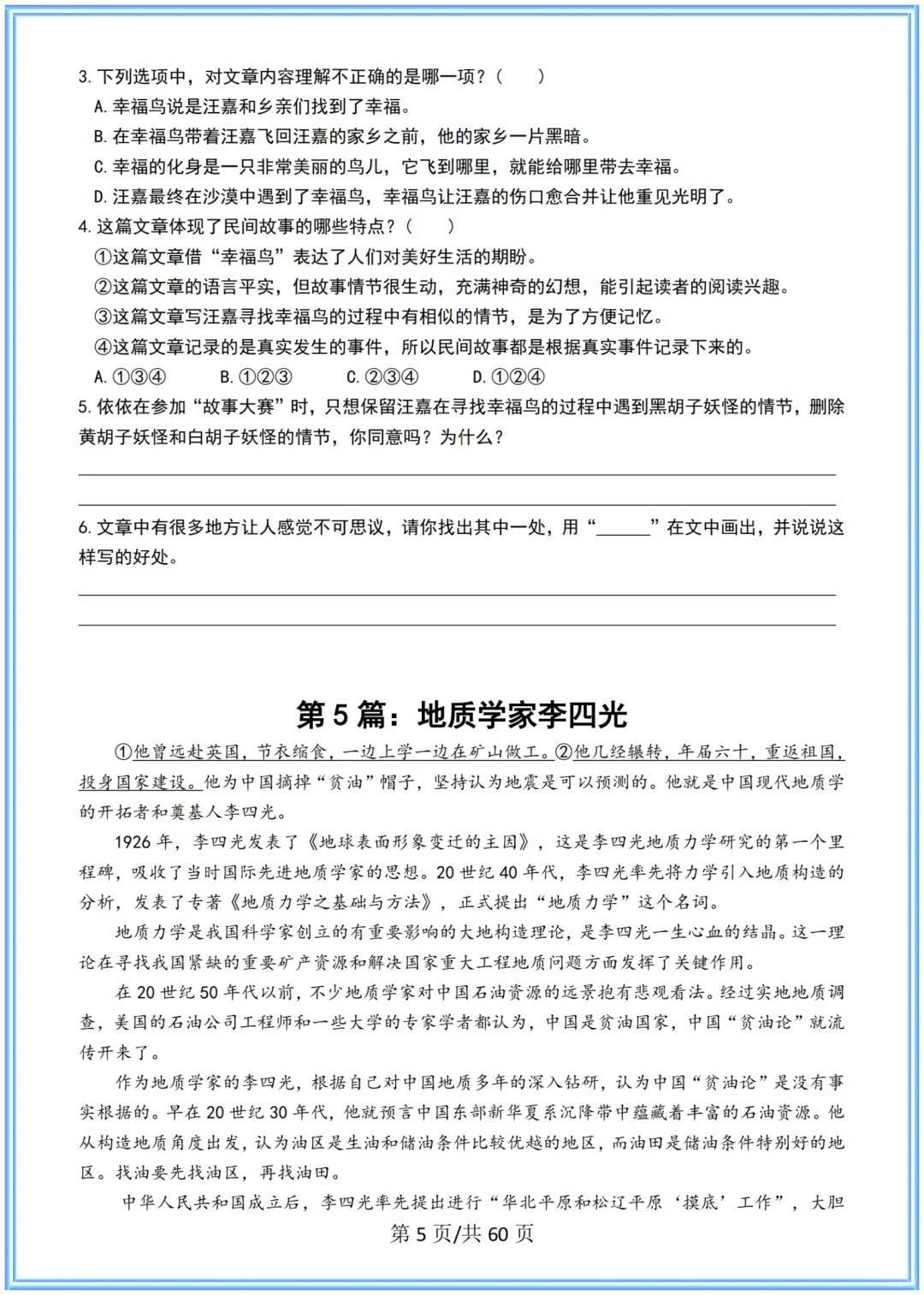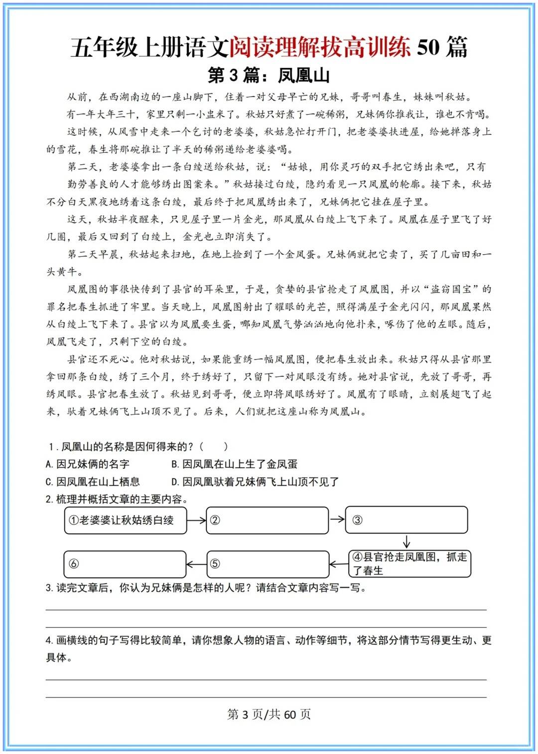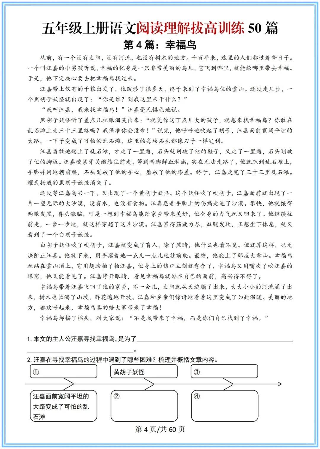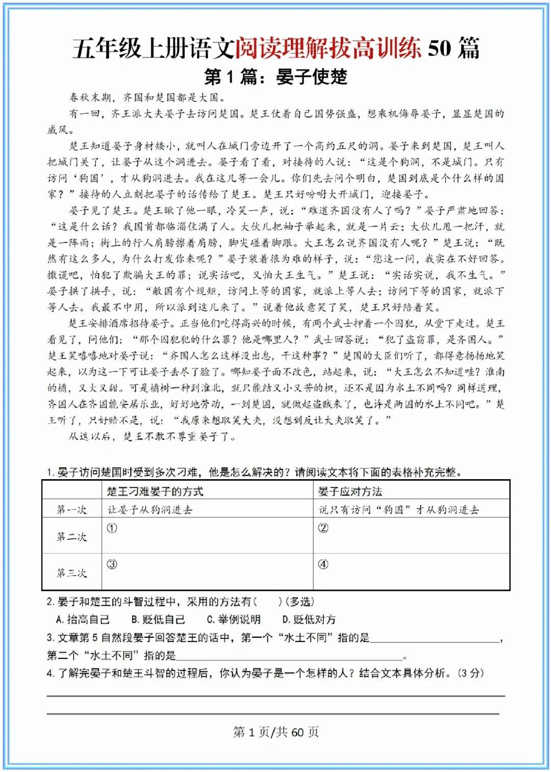 这份五年级上册语文阅读理解拔高训练 50 篇资料,以 “文体多样、题型全面、能力分层” 为特色,涵盖历史故事、科普说明文、民间传说、人物传记等多种文本类型,助力五年级学生突破阅读理解难点,提升文本分析与答题能力。