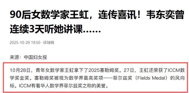 10月28日,王虹拿下了2025塞勒姆奖;27日,王虹还荣获了ICCM数学奖金奖。
