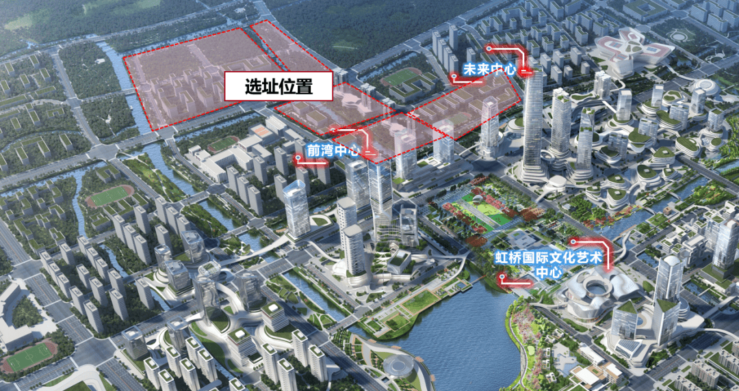 园区选址于虹桥国际中央商务区前湾片区,地处虹桥国际开放枢纽“一核两带”的核心承载区,将由 5 个地块组成,北至儒雅路,东至徐亭路,南至纪翟浦,西至西界河。