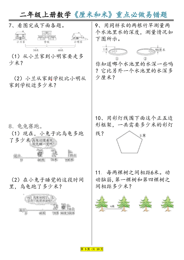 总的来说,这份《米和厘米专项练习题》内容全面、题型丰富,紧扣二年级数学考点,能有效帮助孩子掌握长度单位换算、实际测量和应用题解题技巧。每天练几道,孩子就能慢慢建立起对米和厘米的直观感受,再也不怕单位换算了!