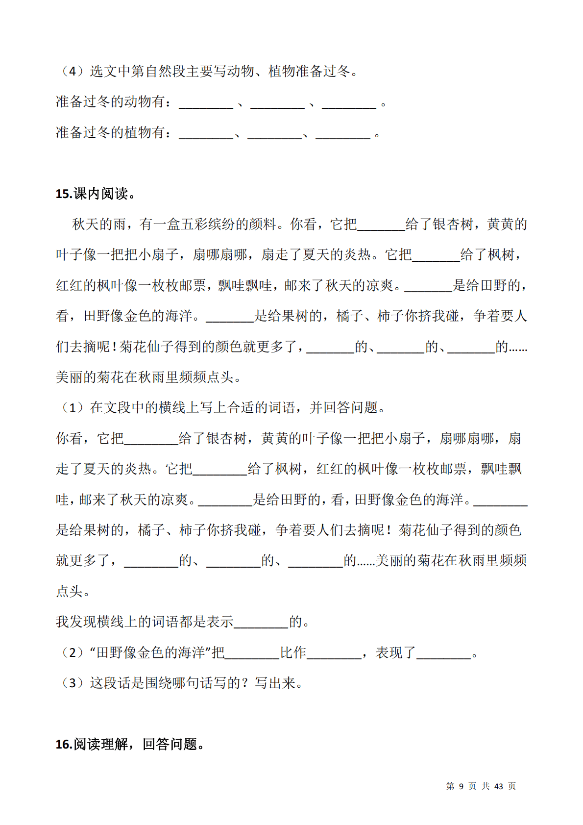 这份资料覆盖了三年级上册语文中所有高频出现的阅读类型,包括《秋天的雨》《花的学校》《在牛肚子里旅行》《铺满金色巴掌的水泥道》等课内重点篇目。每一道题都紧扣教材内容,符合孩子的认知水平,非常适合作为“课内阅读巩固练习”。