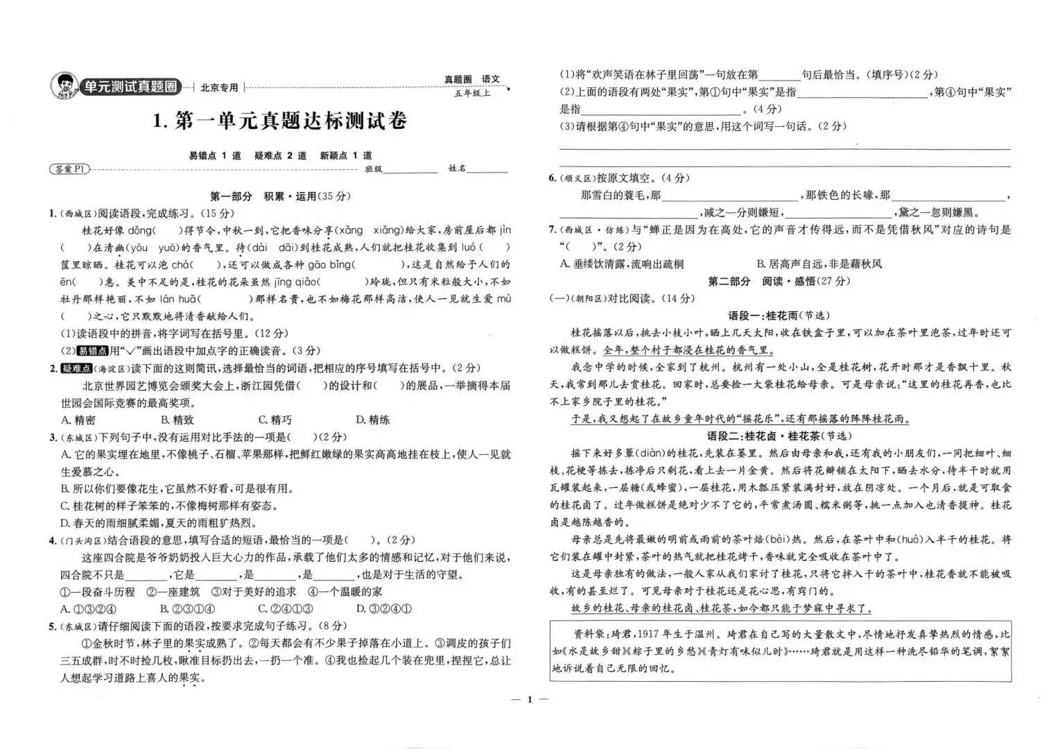 2025秋北京真题圈小学五年级上册语文试卷(电子版可打印)