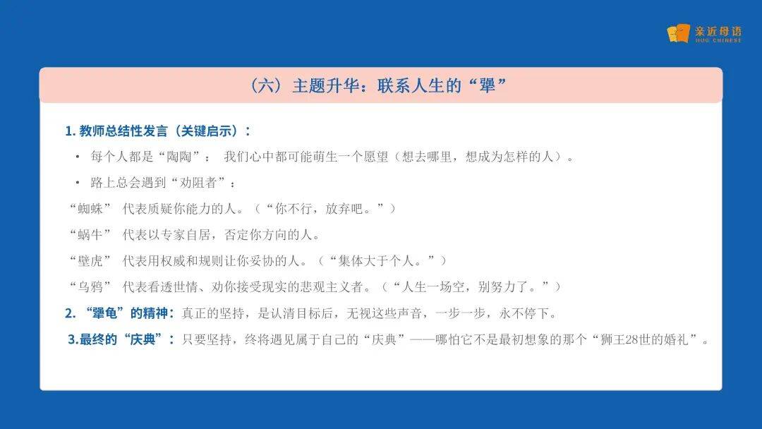 我推荐大家去看最近蒋军晶老师刚上的一节课《犟龟》案例。所有的阅读实际上是要连接到孩子的,各个老师的连接方式不一样,不一定每节课都要把完整的流程从梳理到深度的理解到连接共鸣走完。