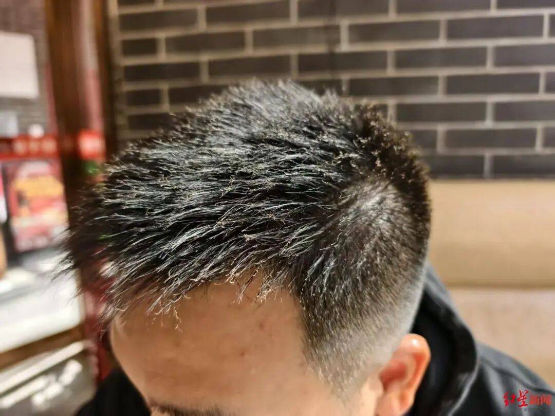 ▲黄先生的头发有被烧过的痕迹