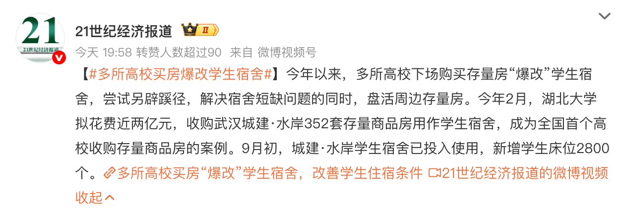 作为第一个“吃螃蟹”的高校,湖北大学拟花费近两亿元收购武汉城建·水岸352套存量商品房用作学生宿舍,新增学生床位2800个,成为全国首个高校收购存量商品房的案例,接着中国矿业大学(徐州)南湖校区花近3亿买商品房当宿舍,还有中南大学、合肥工业大学分别投入2.95亿、1.18亿元推进同类项目,彻底打破了传统的高校宿舍供给模式,开辟出新路径。
