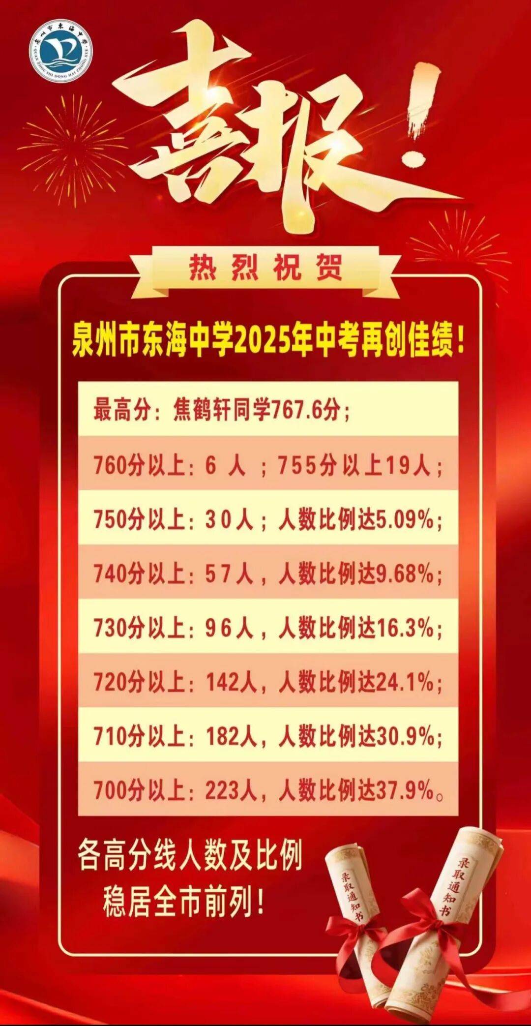 近年来,东海中学教育教学水平持续跃升,办学质量稳居全市公办校前列,赢得各界广泛赞誉。尤其是700分率占比连续多年超过泉州五中,成为泉州公办校第一,综合实力强劲。