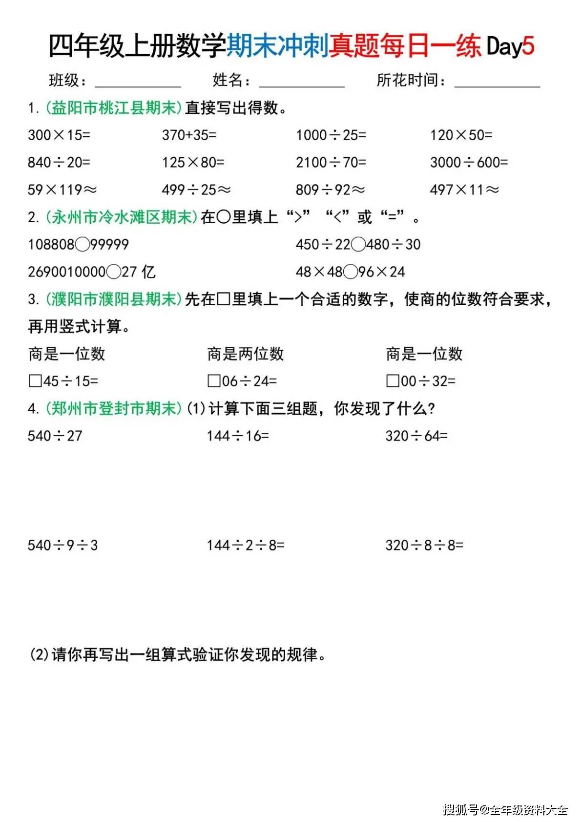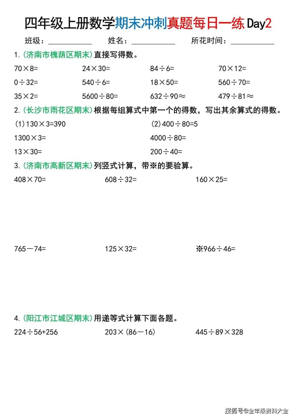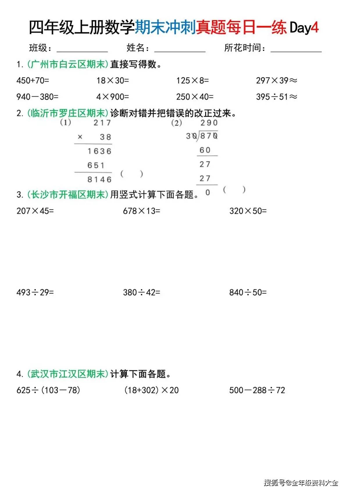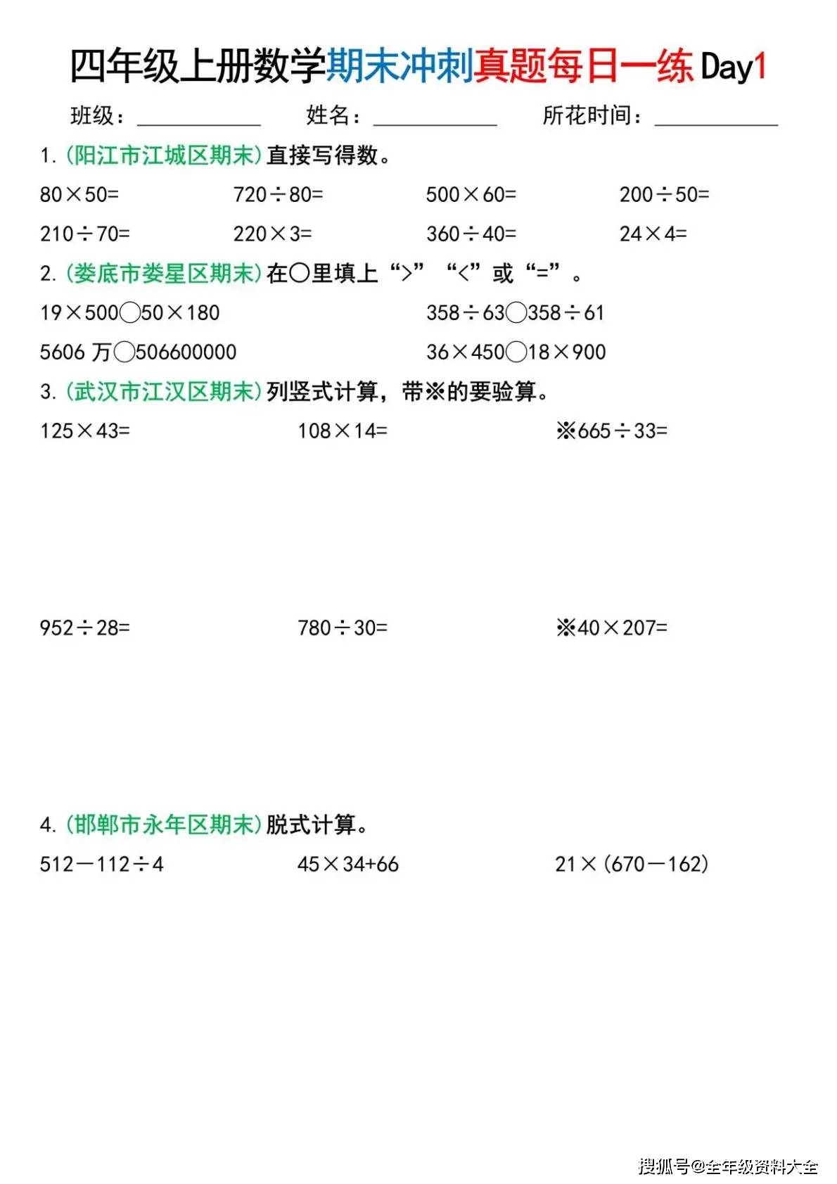 整体而言,这份 16 页的每日一练完全贴合四年级数学期末复习的需求,既是提升计算能力的 “专项训练册”,也是熟悉考试题型的 “真题集锦”,帮学生在期末冲刺阶段精准突破计算模块,从容应对考试中的计算考题!