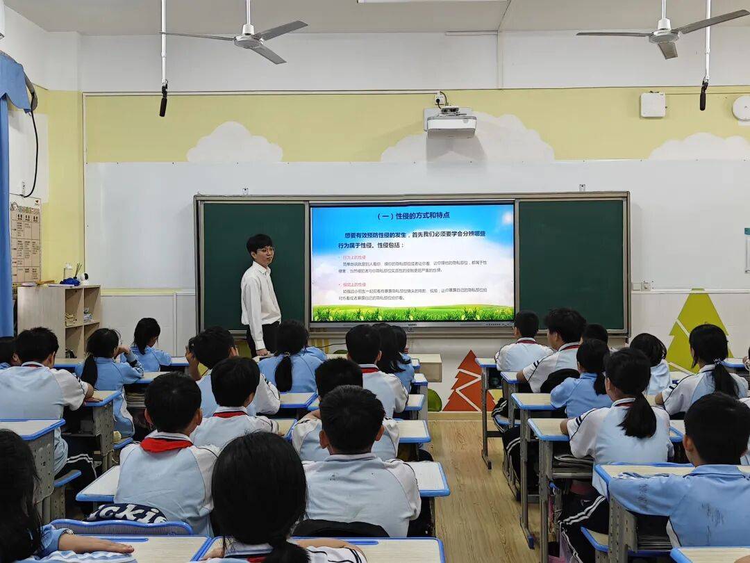 性侵害是危害未成年人身心健康的严重问题,做好防性侵教育,能为孩子穿上 “隐形防护衣”。校外法治辅导员罗琦围绕 “远离性侵害” 主题展开宣讲,她借助精心制作的 PPT 资料,结合真实的新闻案例,生动形象地向学生们讲解了身体隐私部位的划分,让孩子们清楚认识到哪些部位是绝对不能让他人随意触碰的。同时,罗琦还通过情景分析,教孩子们分辨生活中善意与恶意的身体触碰,告诉他们一旦遭遇不法侵害,要第一时间拒绝、呼救,并及时告知信任的成年人,让孩子们学会勇敢说 “不”,掌握保护自己身体的主动权。