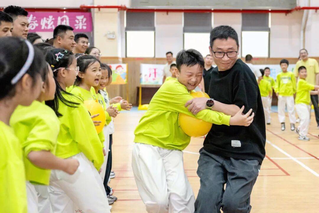 浙江省湖州市长兴县第二实验小学,家长与孩子一起参与“快乐抱抱”亲子趣味运动。谭云俸 摄