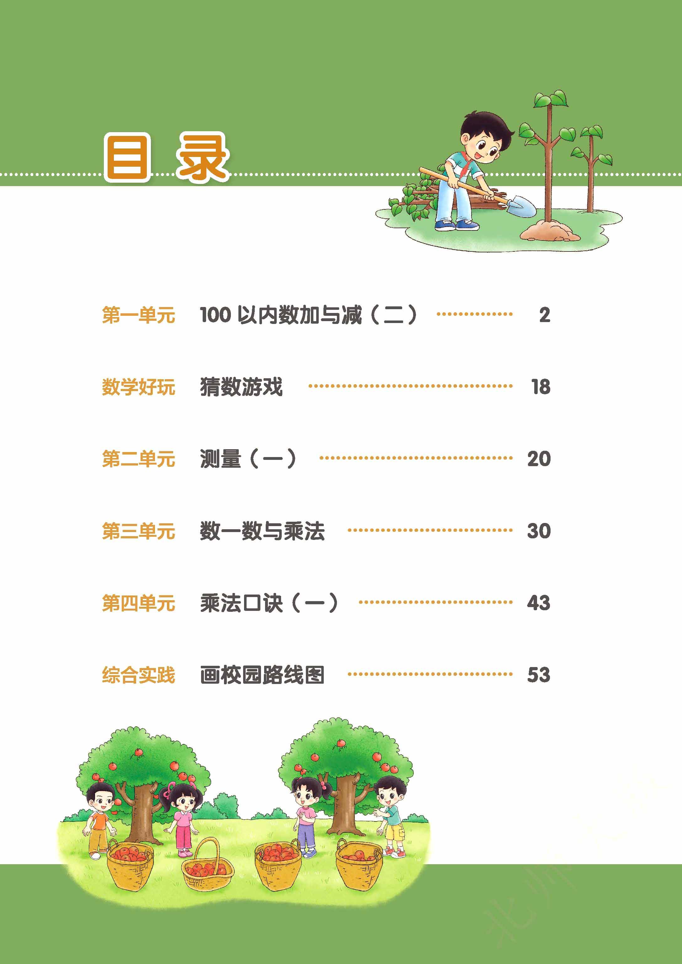 一:2024版最新北师大版小学数学二年级上册电子课本教材目录: