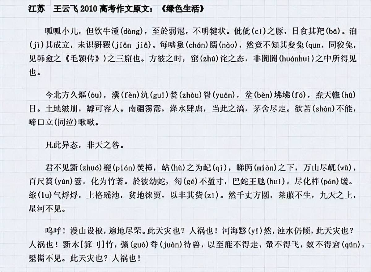 这篇名为《绿色生活》的作文,主题是环境保护。从标题和立意来看,这篇作文与其他高考作文并无二致,放在江苏高考50多万篇作文中,显得并不特别。如果真如表面所看,这篇文章看似平常,恐怕也不会引发如此大的反响。但问题出在文章的形式和语言上——这篇作文全篇使用了文言文,并且采用了具有中国文学特色的“骈文”体裁。骈文是汉朝末期产生,南北朝时期达到顶峰的古老文体。它的特色是讲究句对句对仗工整,发音铿锵有力,且常常使用一些如今不太常见的生僻字,再加上繁复的修辞手法,因此非常难懂。