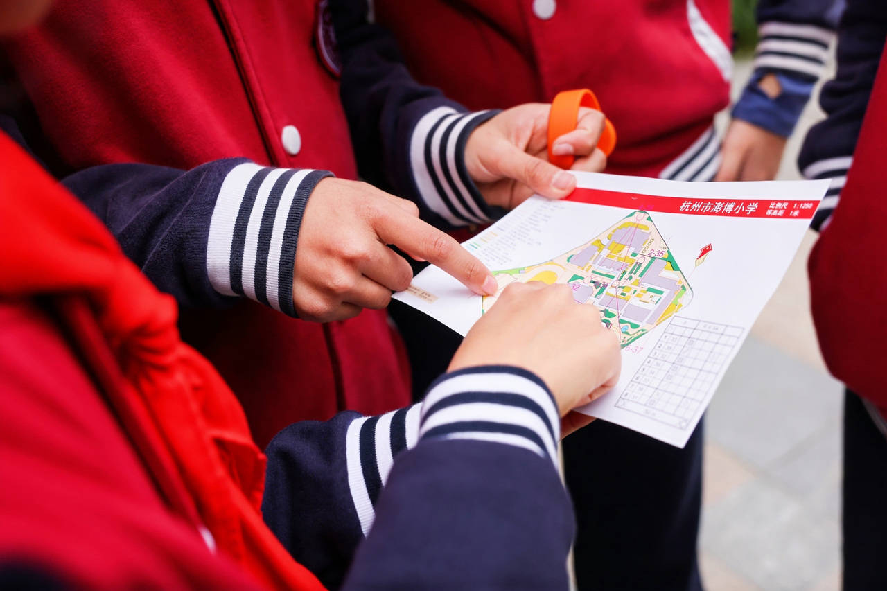 穿梭在校园的角角落落,来来回回寻找点标旗。学生们感叹,日常再熟悉不过的校园,在定向地图上却变成一个个待闯的关卡。根据活动规定,澎博小学四至六年级学生每班派出5名学生组成团队,他们每个人都有不同的分工,有人手持地图辨别方向;有人佩戴手环负责打卡;有人研究路线出谋划策。