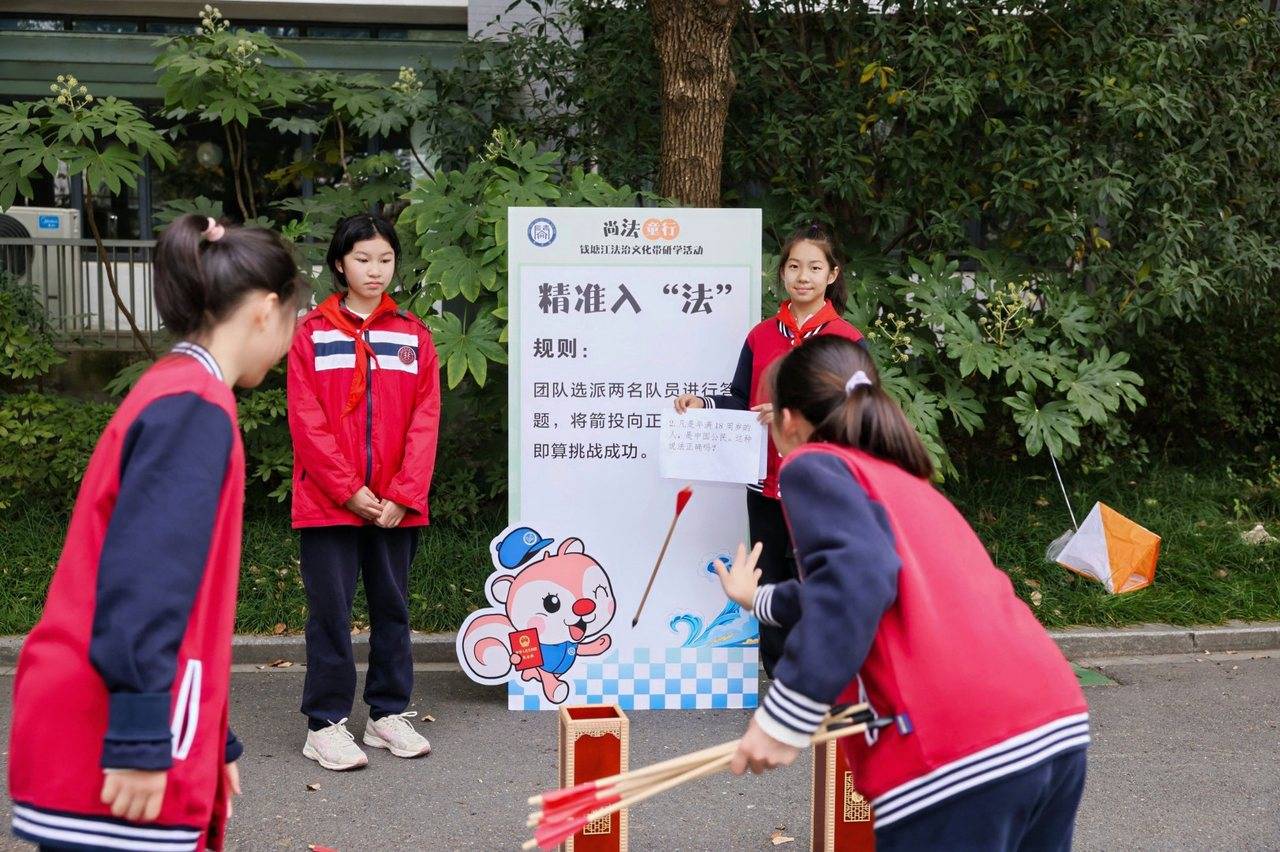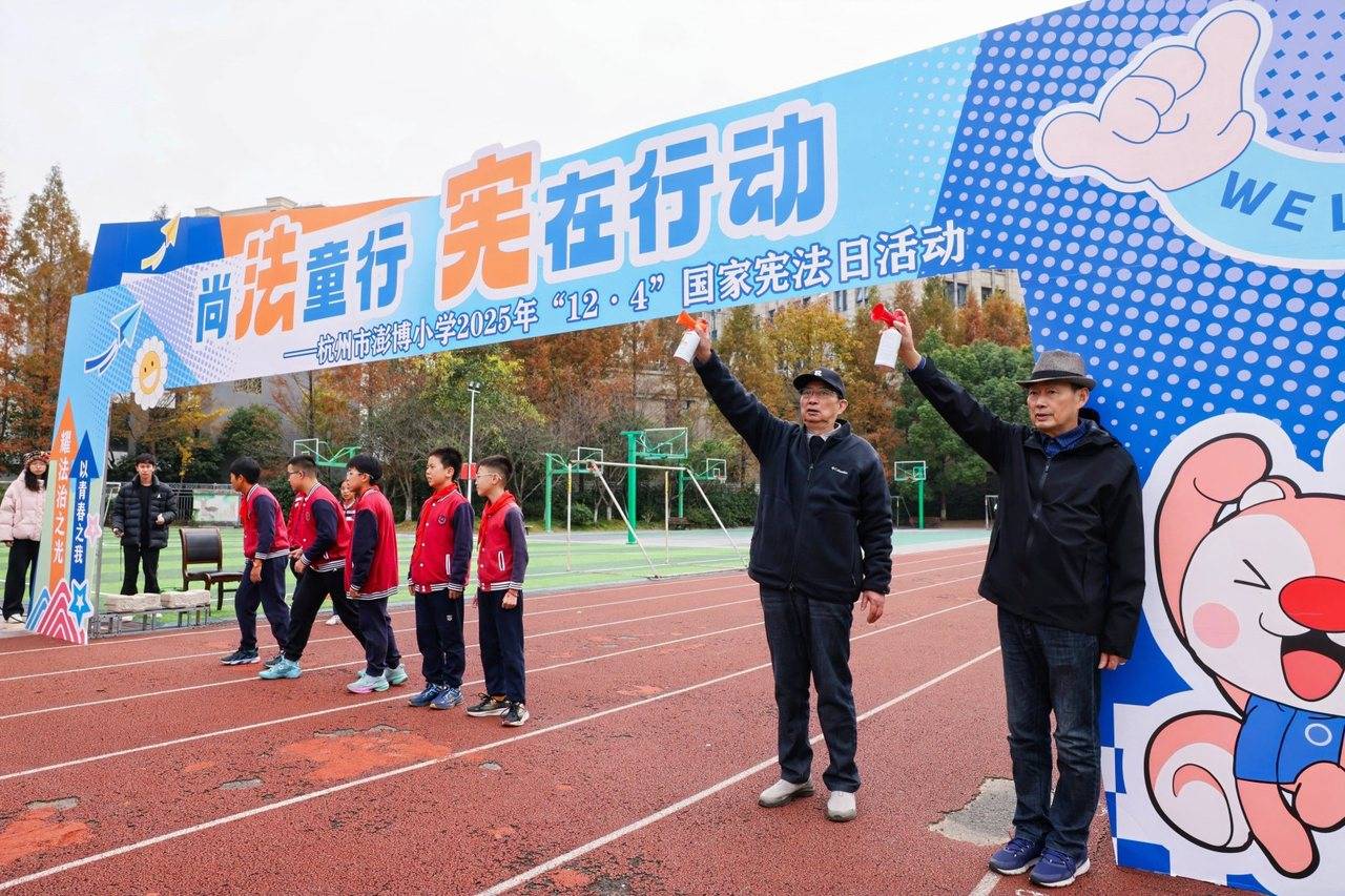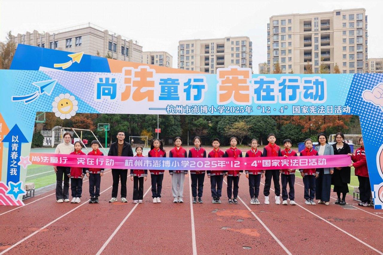 12月2日,“钱塘江法治文化带研学活动(彭埠站)暨杭州市澎博小学2025年“12·4”国家宪法日活动”在澎博小学的校园内热闹启动,这是一场以普及法制知识为主题的“法治定向”挑战赛。