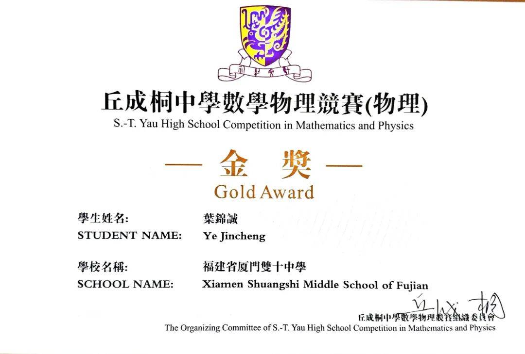 🏆叶锦诚同学以面试第一名的佳绩荣获金奖,由丘成桐先生亲自颁奖。