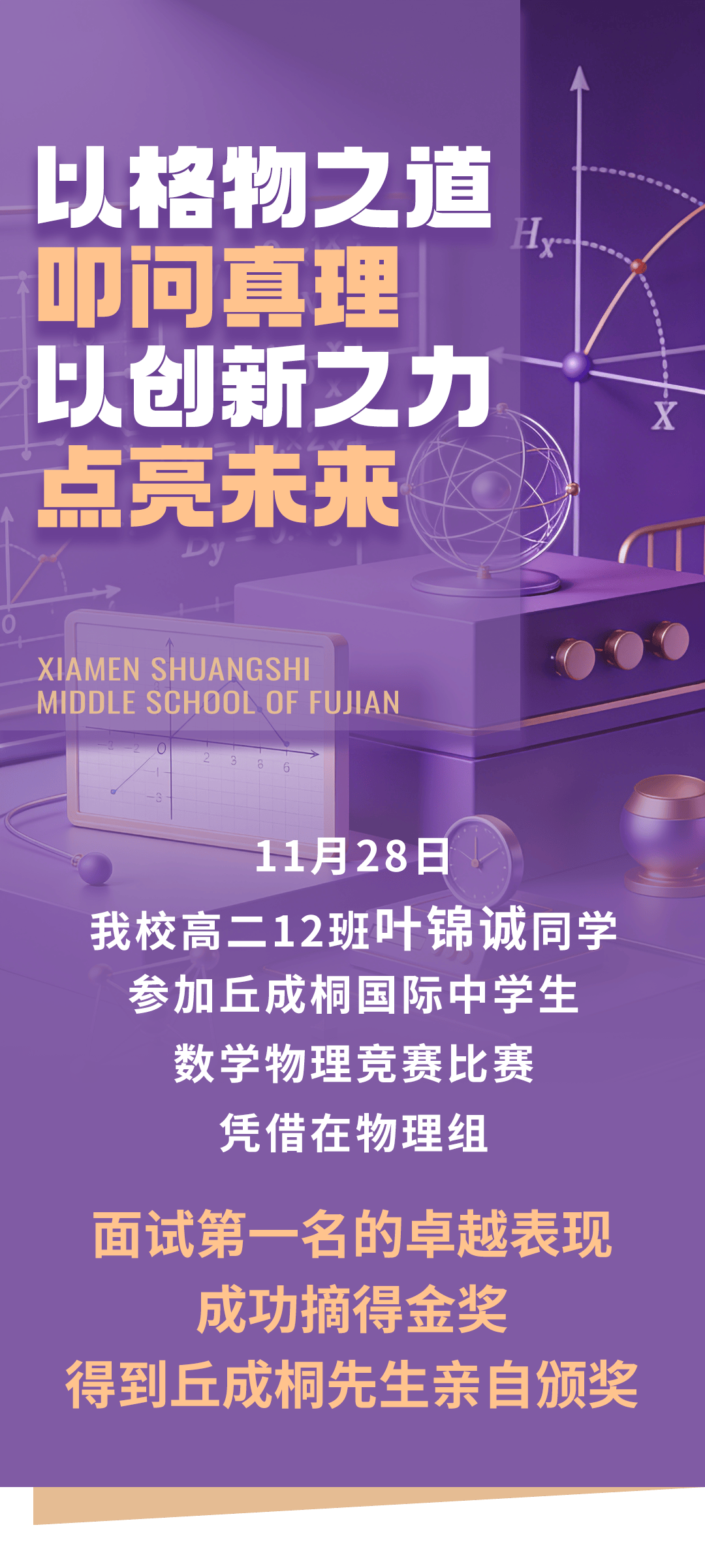 以热爱为火炬,照亮物理世界的深邃;以笃行铸就利剑,斩获赛场巅峰的荣光。祝愿锦诚同学,锦志凌云开启新篇,诚怀笃行突破锋芒。在更广阔的科学天地里,继续探索宇宙的规律,书写属于双十人的热血与荣光!