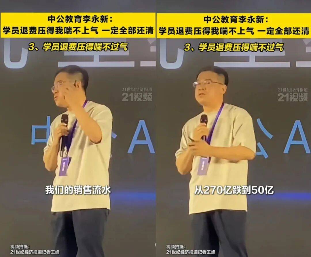 中公教育的创始人李永新曾表示,公司的销售流水从270亿元跌到50亿元。/来源:21世纪经济报道视频截图