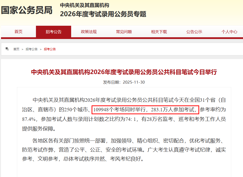 2026年度考试录用公务员公共科目笔试参加人数高达283.1万人