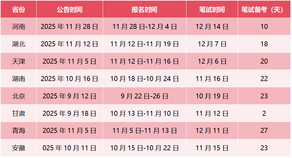 如果说缩招和限报门槛高是“减少上岸机会”,那么备考周期的压缩就是“剥夺准备时间”。从已公布的时间轴来看,多数省份公告发布后迅速组织笔试,留给考生系统复习的时间短到惊人,再叠加命题难度升级,自学备考几乎等同于“裸考”: