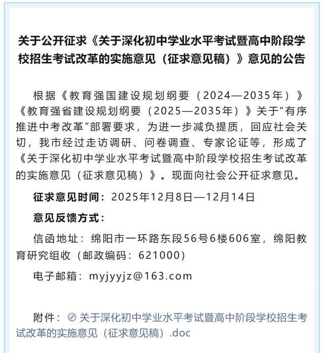 12月8日,绵阳市教育和体育局发布关于公开征求《关于深化初中学业水平考试暨高中阶段学校招生考试改革的实施意见(征求意见稿)》意见的公告(以下简称《实施意见》),宣布将对部分中考科目的考核方式进行调整,2026年实行过渡方案,2027年全面实施。