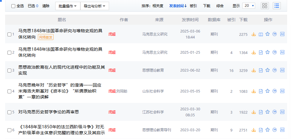闵超老师发表最高档次论文是在“马克思主义研究”上发表的《马克思1848年法国革命研究与唯物史观的具体化转向》引用次数为4次,而同一期刊,同一期,同一主题类型的学术论文有两篇,除了闵超老师的另外一篇的引用量恰好是5次,还是比闵超老师多一次。