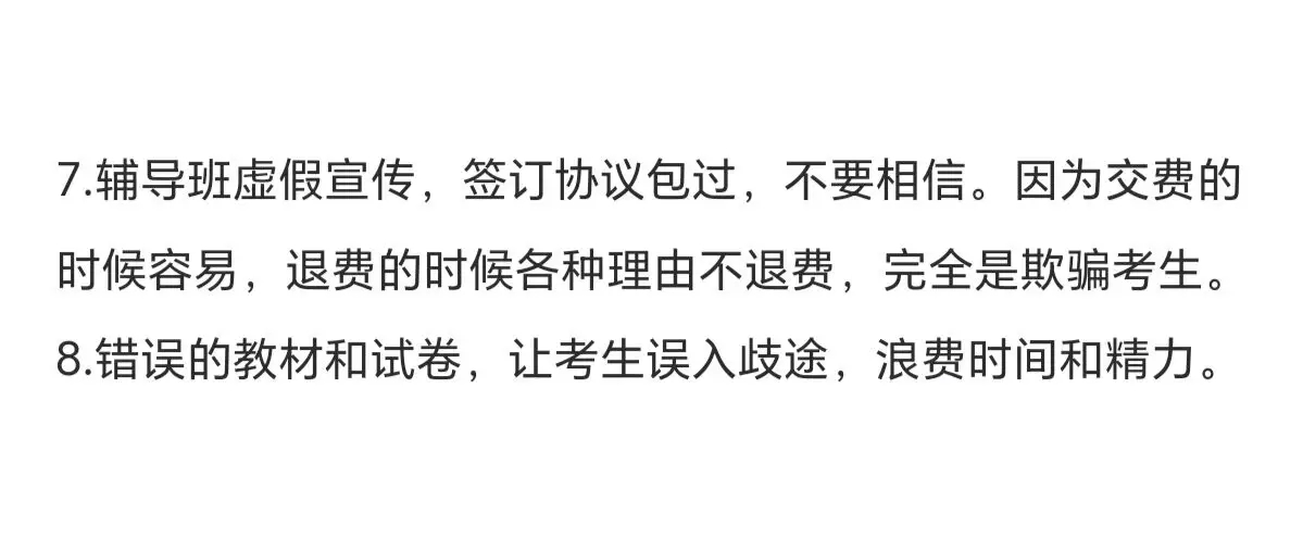 5.辅导班都是私人的。辅导班的老师都不是我校的老师,都不是大学教授。因为辅导班的老师都不是权威的,所以讲课的内容与考试内容不同,具有误导性。