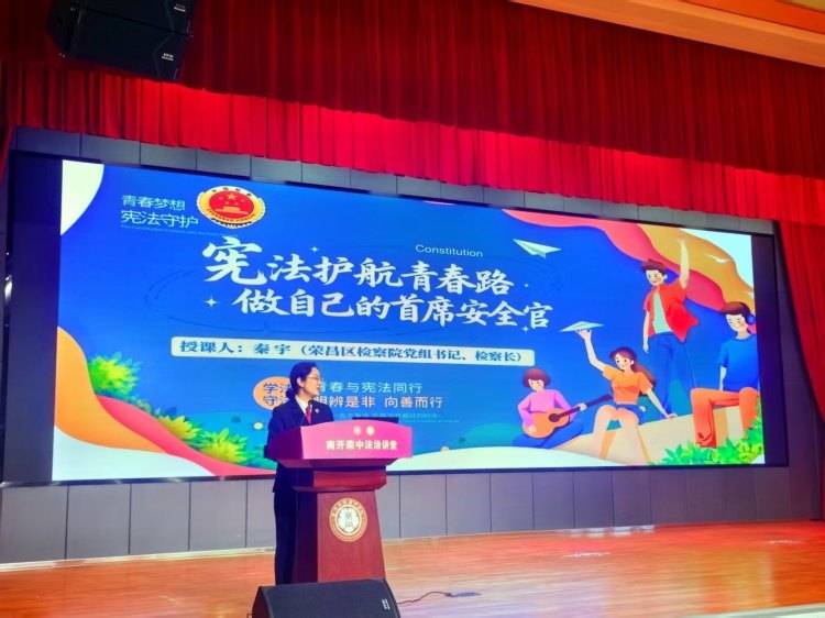 日前,重庆荣昌区检察院党组书记、检察长秦宇走进南开荣昌中学校,以“宪法护航青春路 做自己的首席安全官”为主题,为师生带来一堂生动的法治课。