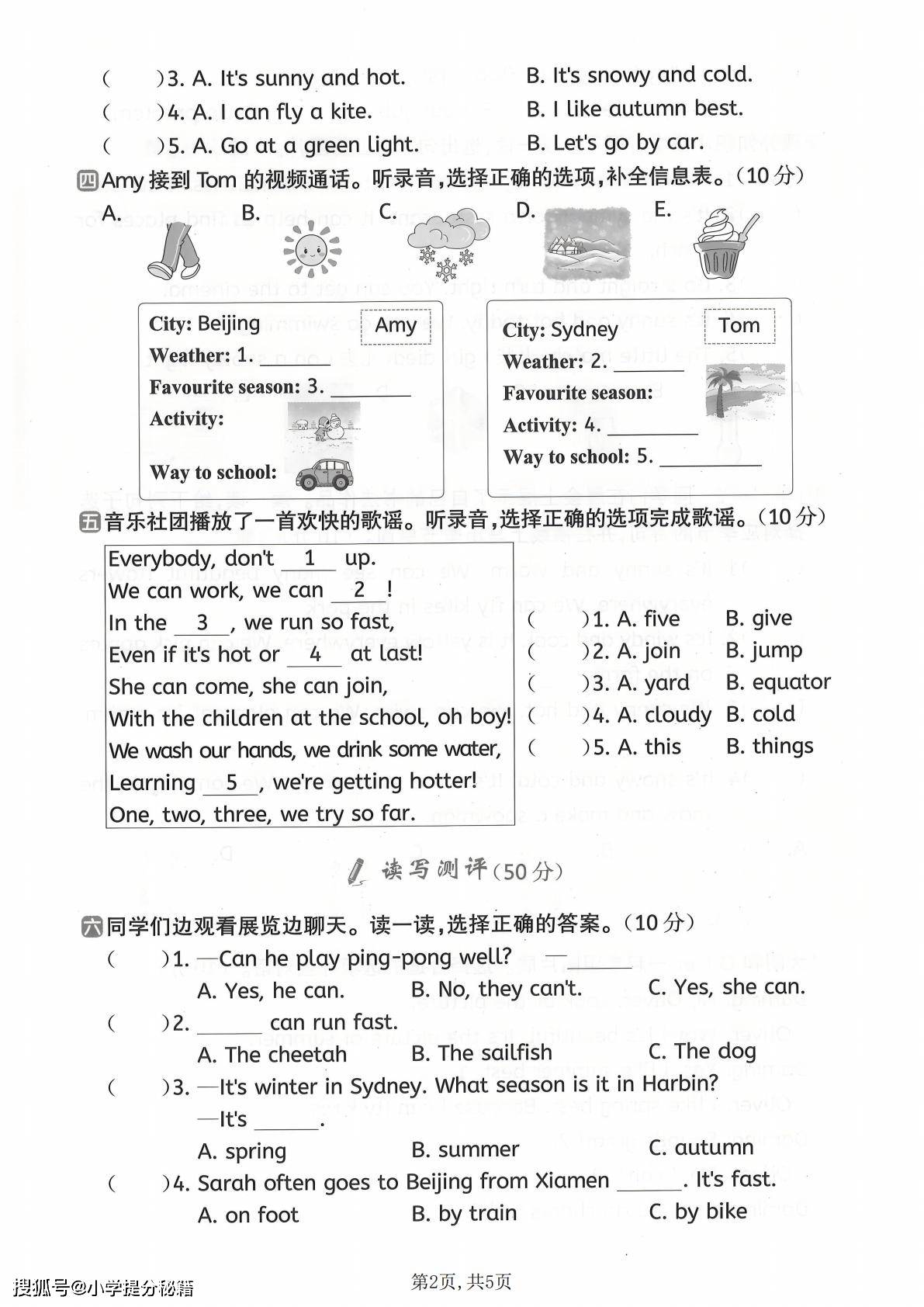今天为大家分享:以 “学校成果展览” 为核心主题串联全卷,包含听力测评与读写测评两大板块,覆盖了外研版四年级英语的核心学习内容。听力测评部分围绕成果展览的校园场景展开,题型包括 “选与录音相符的图片”“判断图片与内容是否相符”“选择正确答语”“补全信息表”“完成歌谣”,内容聚焦教材中的核心词汇(如活动、场所、天气、季节等)、句型(能力表达、天气询问、出行方式等),既考查听力的基础辨识能力,也训练信息提取、语境匹配的综合运用能力。