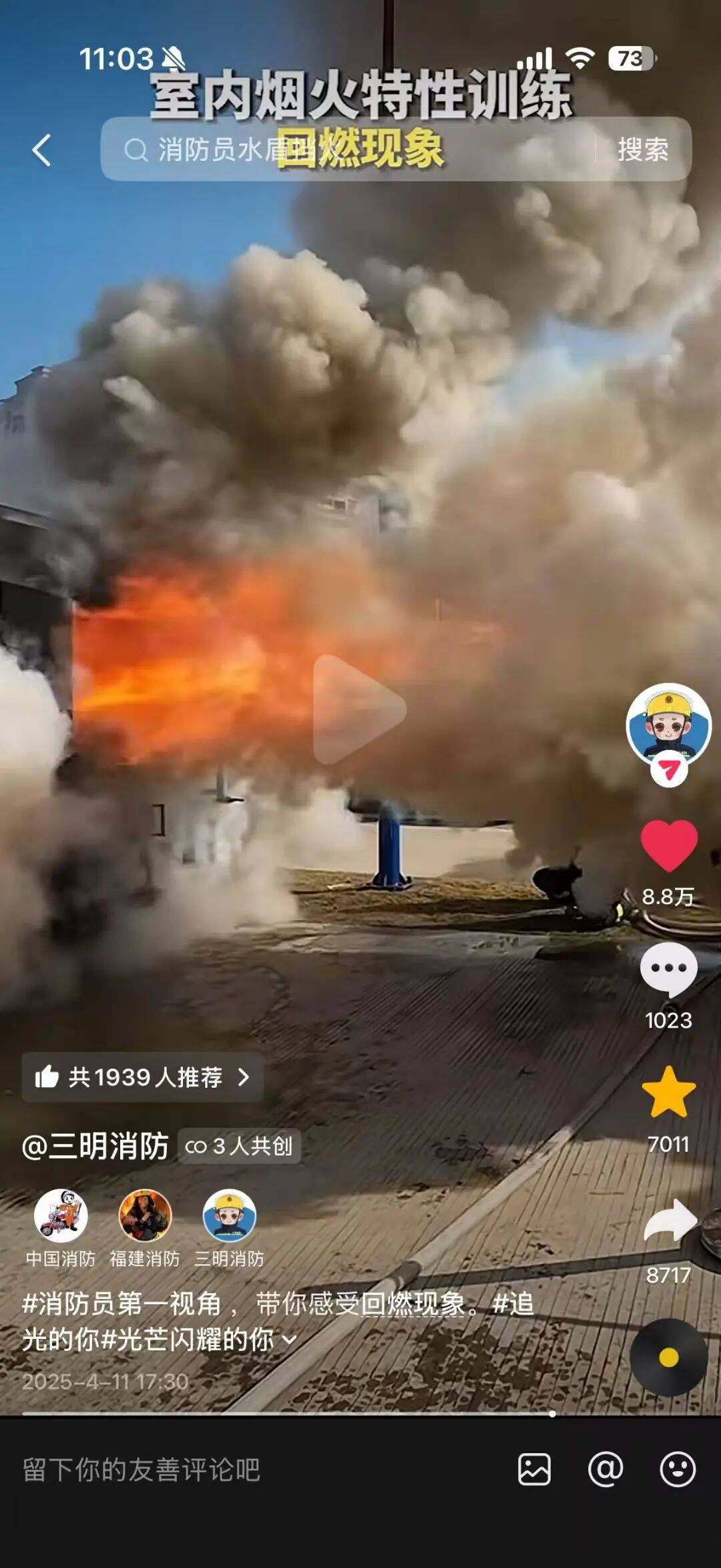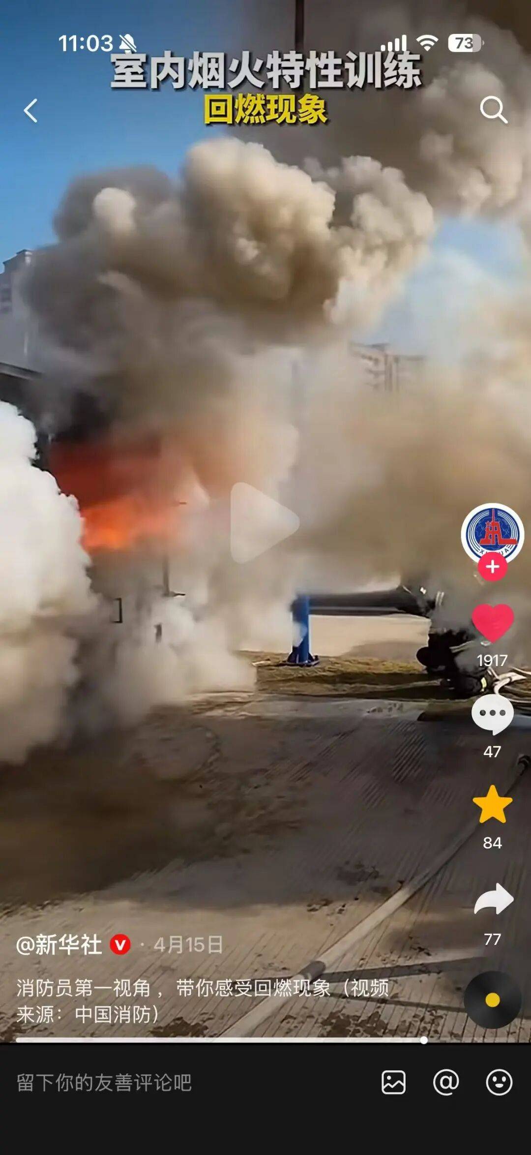 人民日报转发短视频《第一视角直击消防员滚燃训练现场》
