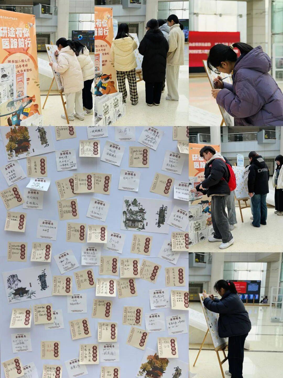 二楼大厅还设置了考研许愿留言板,那些藏在心底的目标院校,那些日复一日的坚持与期盼,那些为并肩作战的研友写下祝福,互相打气,携手同行的鼓励,都可以在这里留下痕迹,定格考研学子的期许与勇气!此时,许愿留言板成为了图书馆里最温暖的风景,也成为学子们考研路上一份珍贵的纪念。
