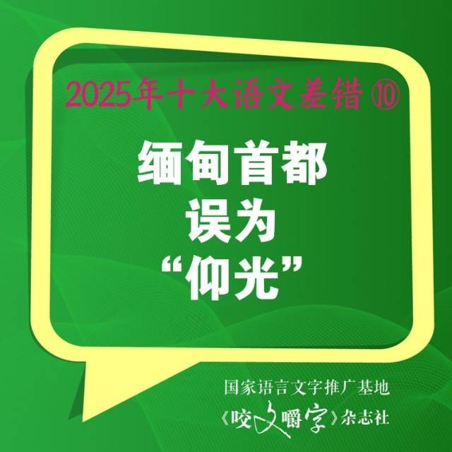 十、缅甸首都误为“ 仰光”。2025年初,我国一名演员被骗入缅甸电信诈骗园区。幸运的是,他最终获救。此事引发广泛关注,但不少媒体在报道中将缅甸首都误称为“仰光”。其实,如今缅甸首都是“内比都”。仰光于1755年建城,在1948年缅甸独立后被定为首都。2005年11月,缅甸首都从南部沿海的仰光迁往中部山区的内比都。内比都于2003年始建,并在2006年3月被命名为“内比都”,其意为“皇家首都”。仰光距离内比都约400千米,仍是缅甸最大的商港和世界闻名的旅游城市,但已不再是缅甸首都。