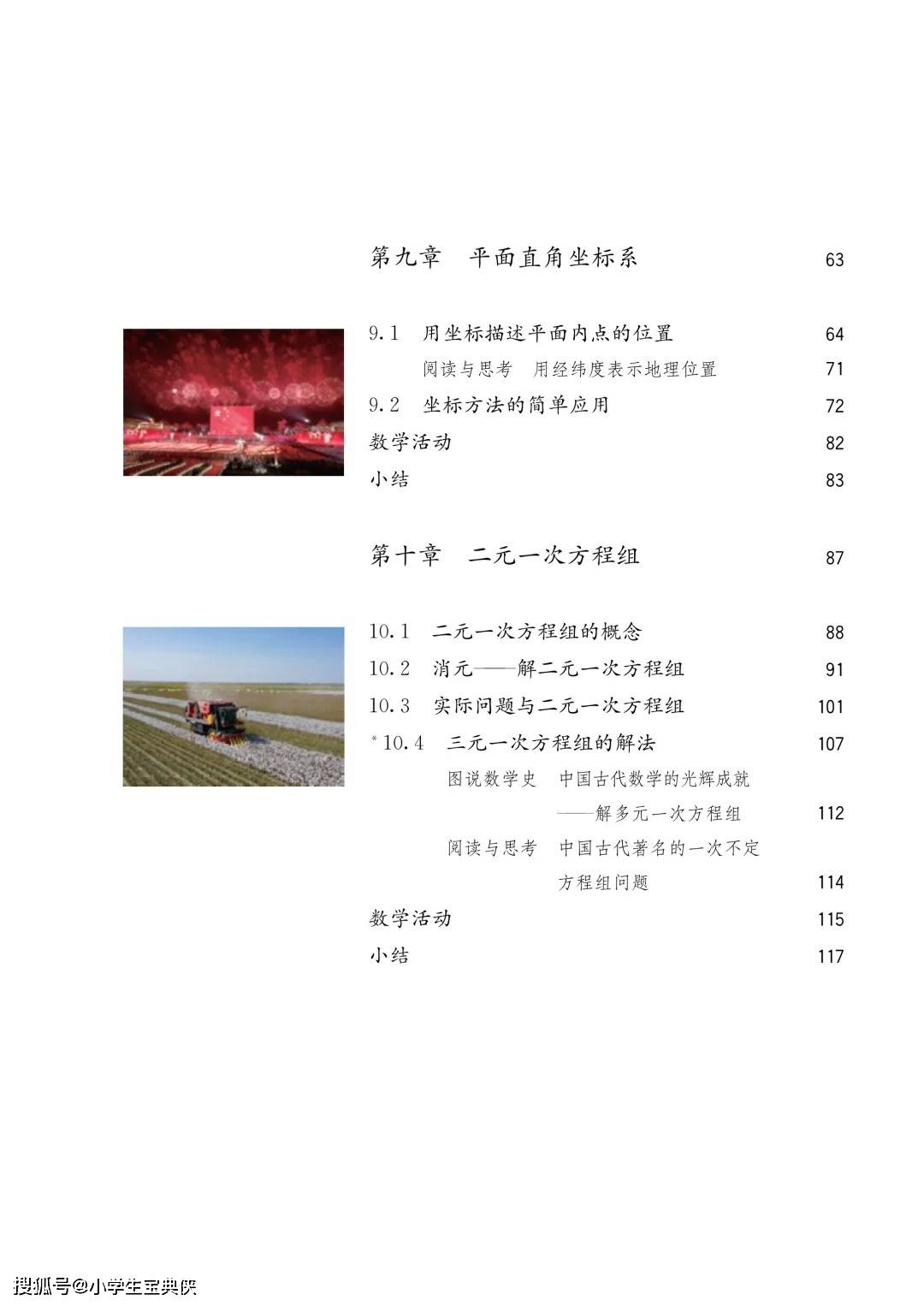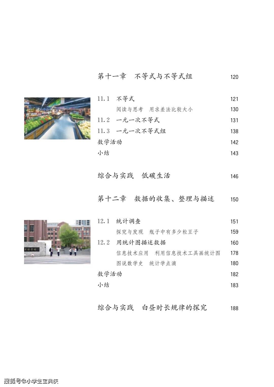 在代数模块,教材通过二元一次方程组、不等式与不等式组的学习,引导学生建立数学模型解决实际问题。从 “消元法” 解方程组,到不等式的性质与解法,再到利用统计图表描述数据,让学生逐步提升抽象能力、运算能力与应用意识。教材还融入 “低碳生活”“白昼时长规律的探究” 等综合实践活动,让学生在解决真实问题的过程中,理解数学与生活的紧密联系。