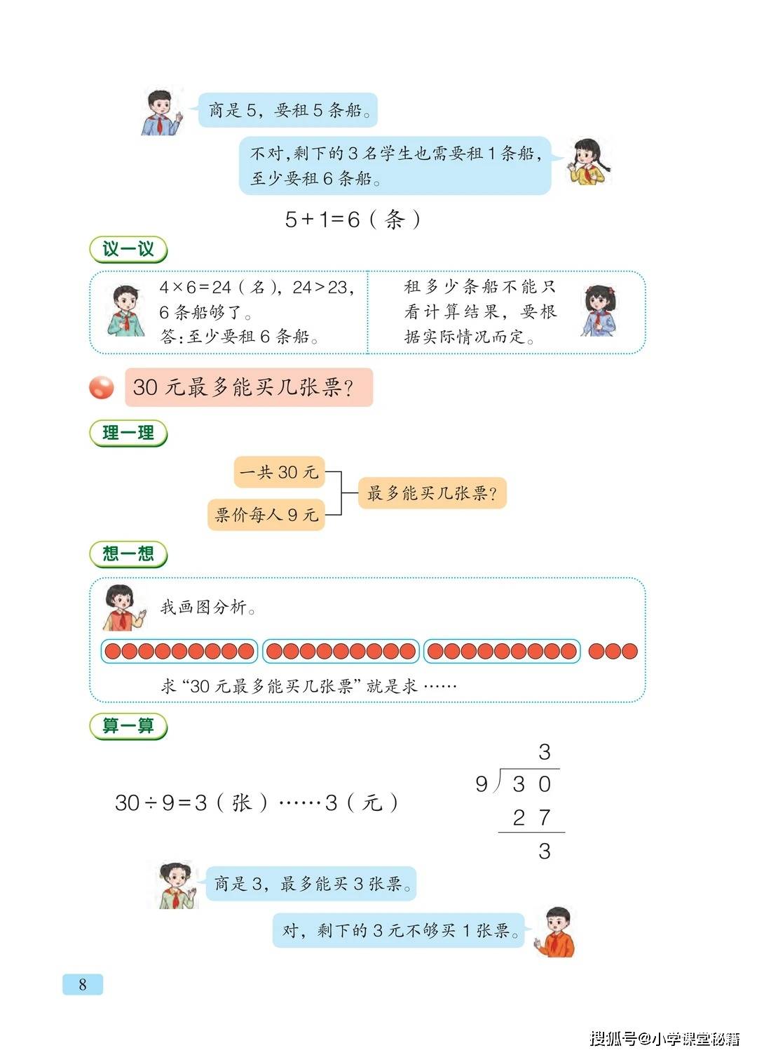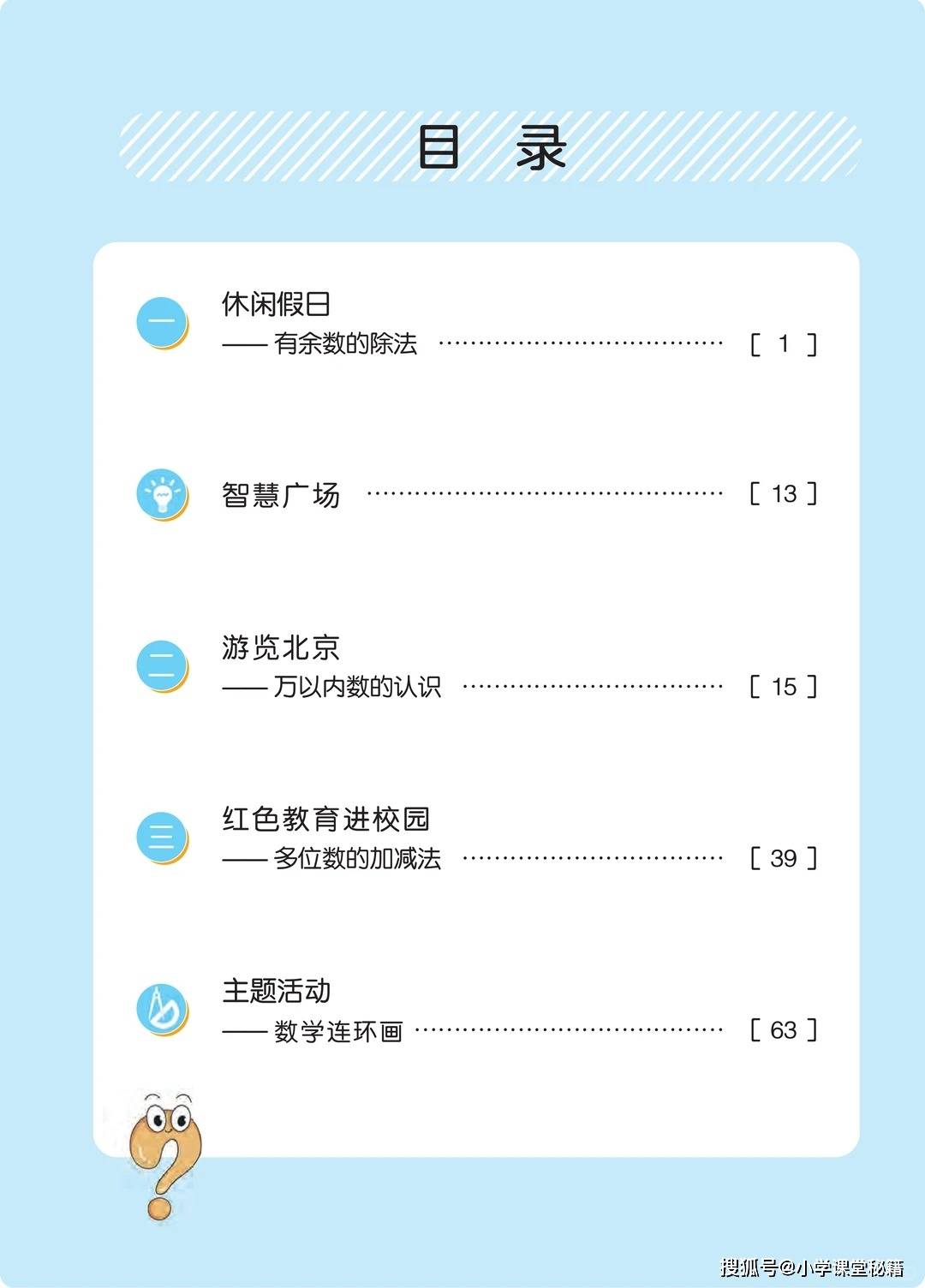 这份教材对学生的学习有着切实的帮助。有余数的除法学习为后续除法运算和分数概念奠定了基础,让学生初步接触 “余数必须小于除数” 的数学规则;万以内数的认识拓宽了学生的数感,使其能更好地理解生活中的数量关系;多位数加减法的练习不仅提升了运算熟练度,还通过实际问题的解决,让学生体会到数学的实用性。解决问题和分类单元着重培养学生的逻辑推理与归纳能力,使其能从复杂信息中梳理出解题思路;而 “智慧广场” 和主题活动的趣味内容,则激发了学生的探索欲,让他们在轻松的氛围中掌握数学方法,逐步形成数学思维。