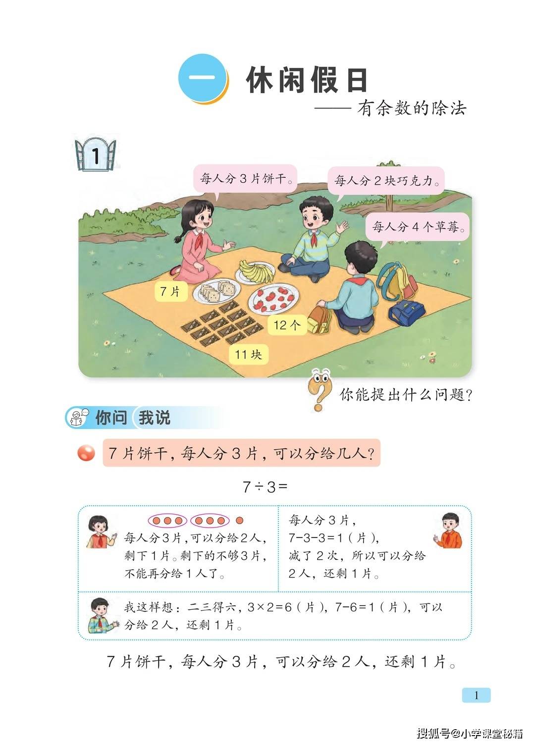 今天为大家分享:青岛版六三制二年级下册数学教材以生活化场景为切入点,将数学知识与日常实践深度结合,构建了一套贴合低年级学生认知特点的学习体系。教材开篇以 “休闲假日” 的野餐场景引入有余数的除法,为学生搭建起从具象到抽象的数学学习阶梯。
