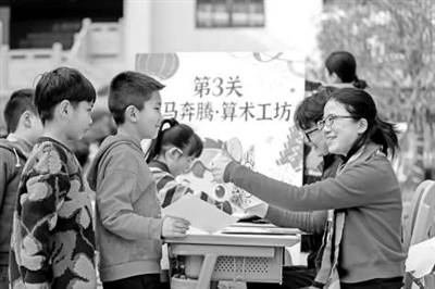 在位于福建省福州市台江区的福州四中光明校区(小学部),学生正在“小马奔腾·神算工坊”游园环节体验数学乐趣。 通讯员 谢贵明 摄