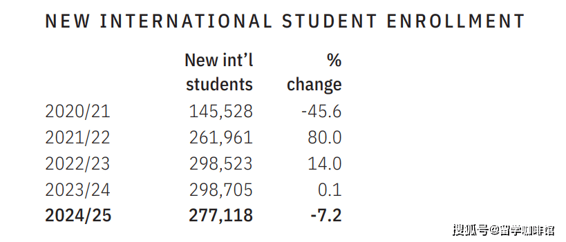 尽管国际学生总量上升,但 2024/25 学年新入学国际学生人数同比下降 7.2%,总人数约为 27.7 万人。