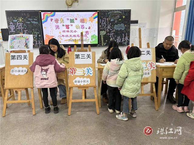 “语”你同行环节中,“拼读小能手”“识字小达人”“书声琅琅”“口语与表达”等关卡依次展开,孩子们随机抽取测试内容,以准确的发音、流利的朗诵和绘声绘色的故事讲解,展现着一学期的学习积淀。一张张点亮满星的闯关卡,成为活动中最亮眼的风景,既激发了学生的学习热情,更让他们在互动中感悟中华语言之美。