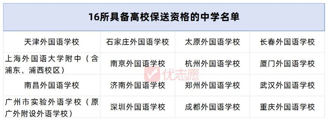 全国共16所外国语中学拥有保送资格,这些学校推荐的学生,经外语能力测试等考核环节合格后,可获得高校保送资格。