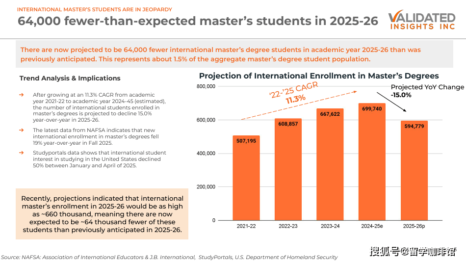 此前预测显示,2025/26 学年美国国际硕士生人数有望达到 66 万人,而最新估算则下调了约 6.4 万人。
