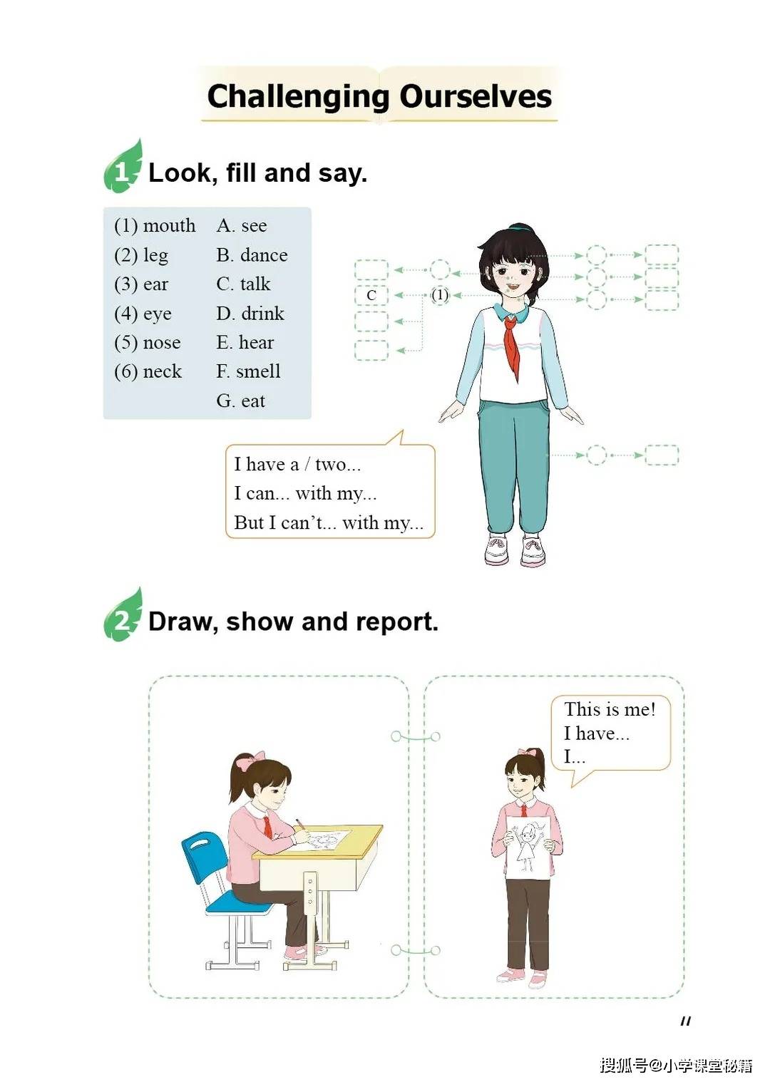 更值得关注的是教材对 “学用结合” 的深度设计。每个单元的 “Lesson 1-3” 结构清晰:Lesson 1 通过情景对话和游戏输入词汇句型,Lesson 2 用机器人、校园场景深化理解,Lesson 3 则通过歌谣、角色扮演完成输出。“Challenging Ourselves” 板块还设计了调查报告、角色表演等任务,让孩子在真实的语言运用中巩固知识。比如在 “Wonderful Me” 单元的小组表演里,孩子用英语介绍自己的身体部位,既是语言练习,也是自我认知的启蒙。
