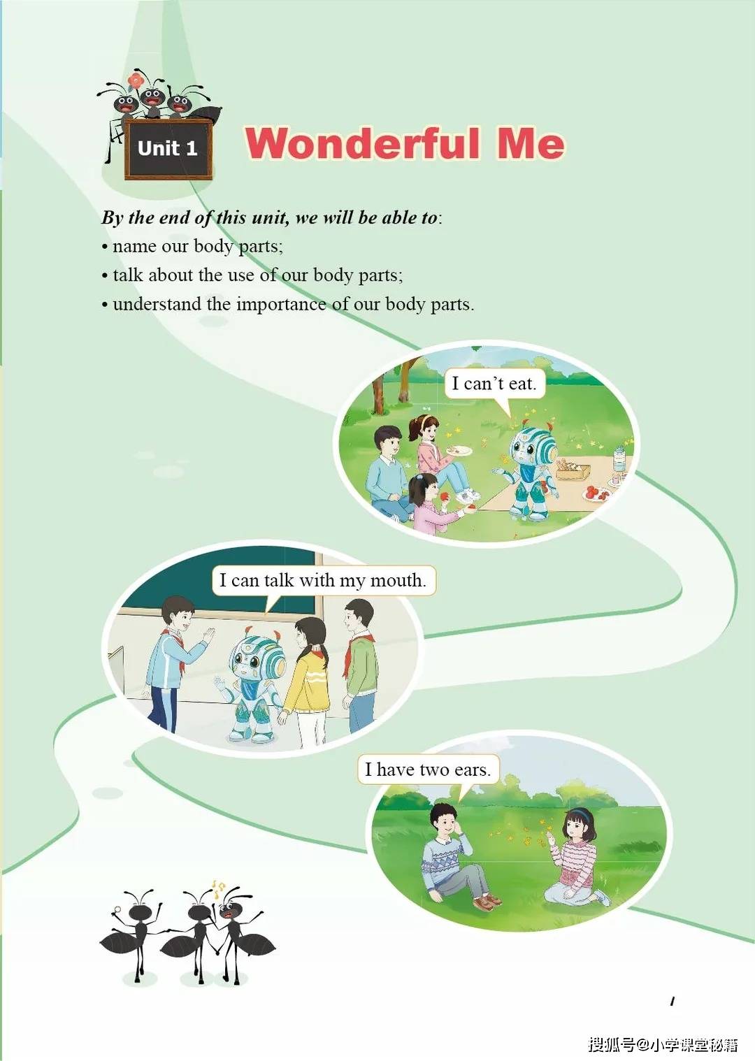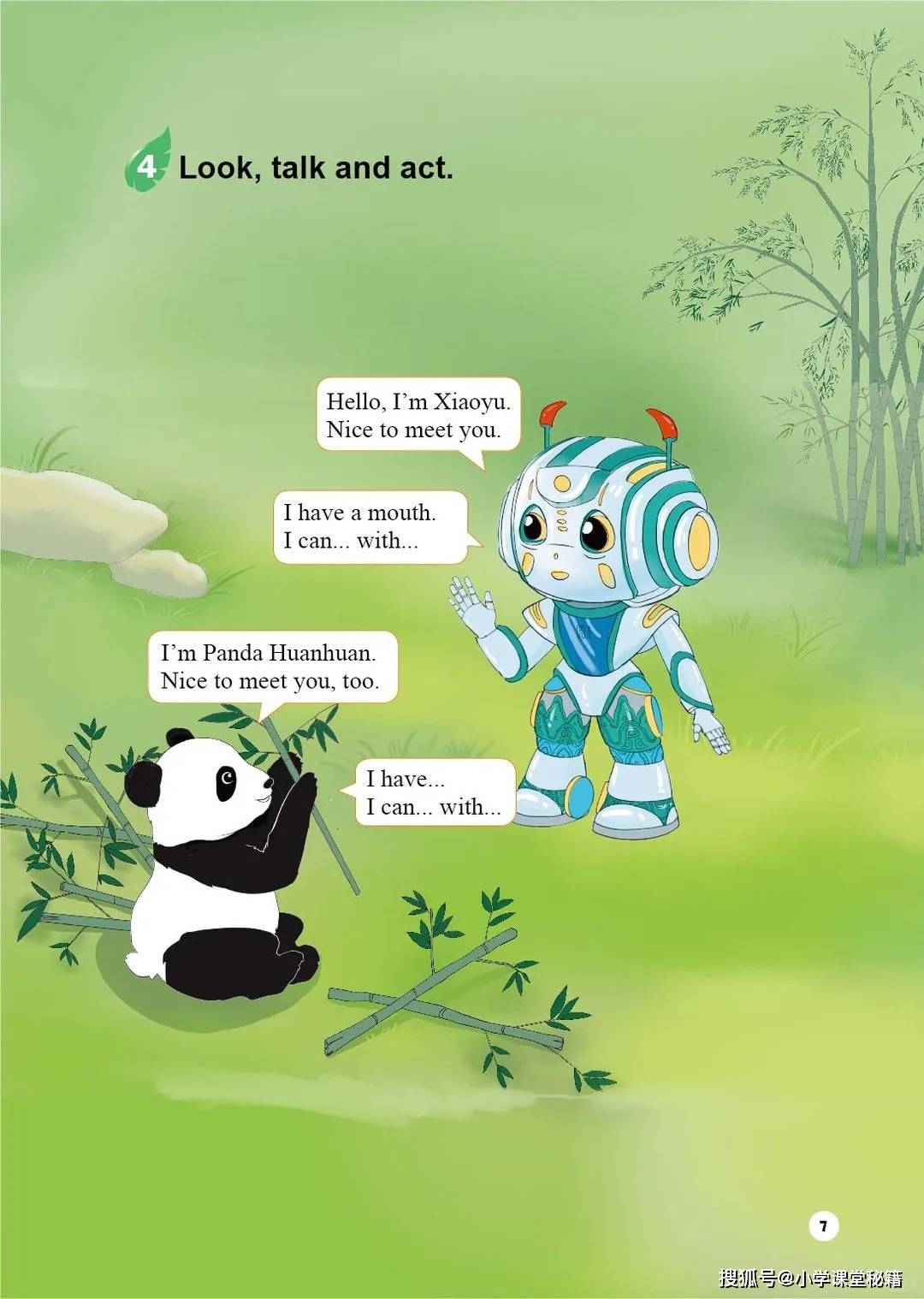 开篇第一单元 “Wonderful Me” 就用 “Say and Touch” 的互动游戏,让孩子在触摸鼻子、耳朵的动作中,自然记住 “mouth”“eyes” 等身体部位词汇。机器人 Xiaoyu 的登场更是点睛之笔,“I can talk with my mouth” 的对话,把词汇和功能结合起来,让孩子明白 “学英语是为了表达自己”。当孩子戴着老虎头饰模仿动物介绍身体时,英语学习就成了一场充满笑声的游戏。