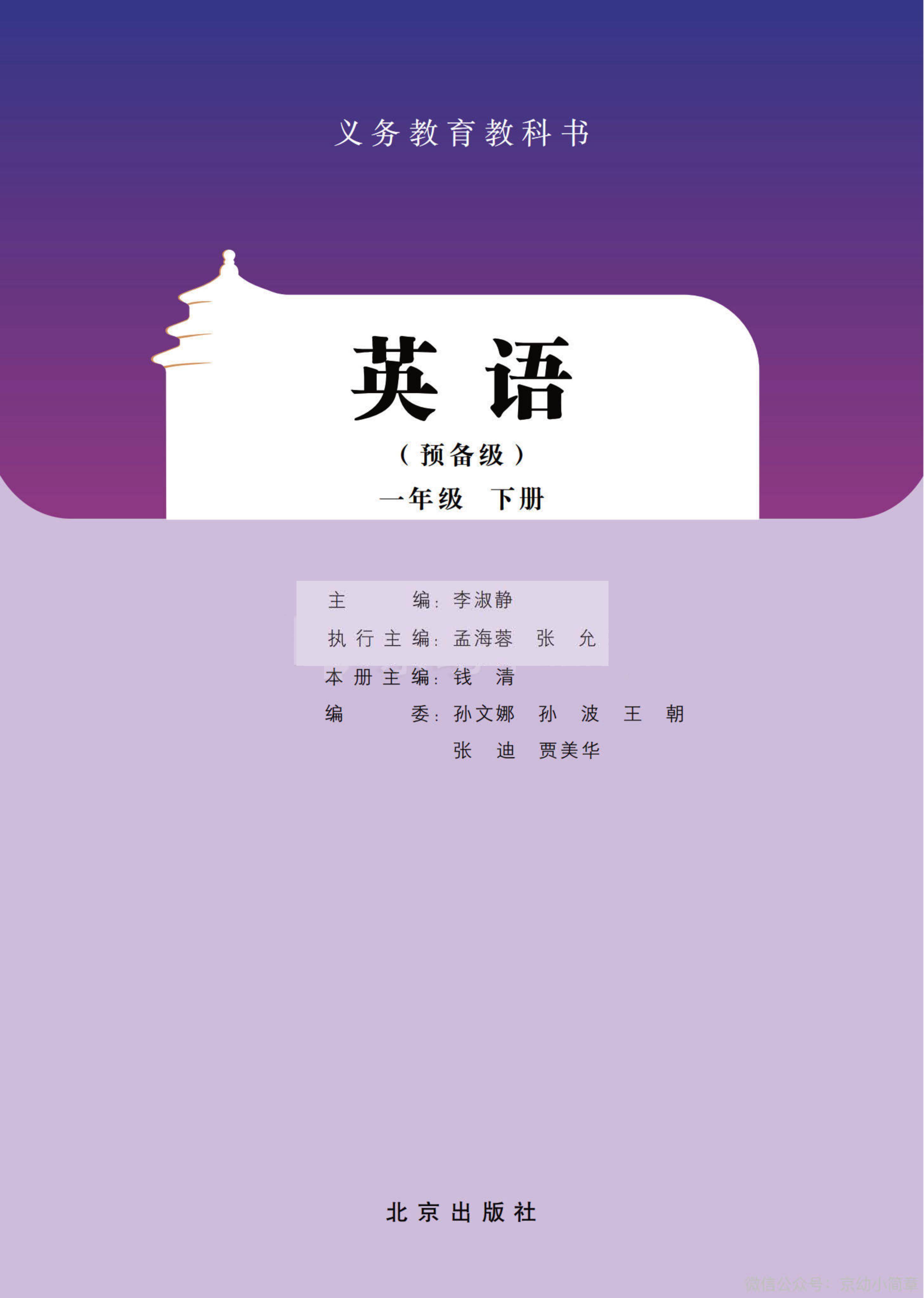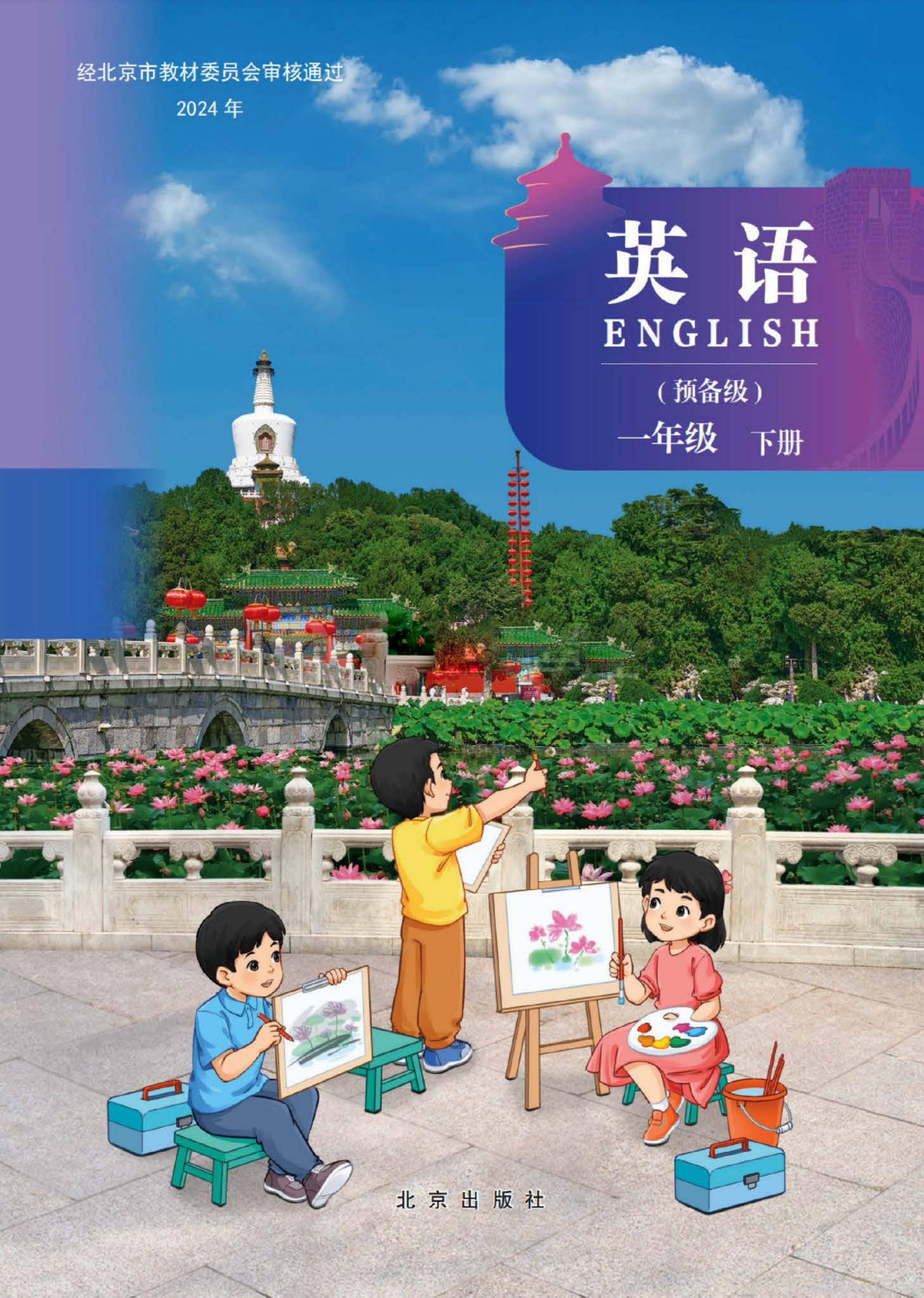 今天为大家分享:这本北京版一年级下册英语课本,最先被封面吸引 —— 北海公园的白塔、荷花池,还有三个孩子写生的画面,浓浓的北京味儿扑面而来。作为预备级教材,它没有复杂的语法,就是用唱歌、游戏、讲故事的方式,让孩子在轻松的氛围里爱上英语。