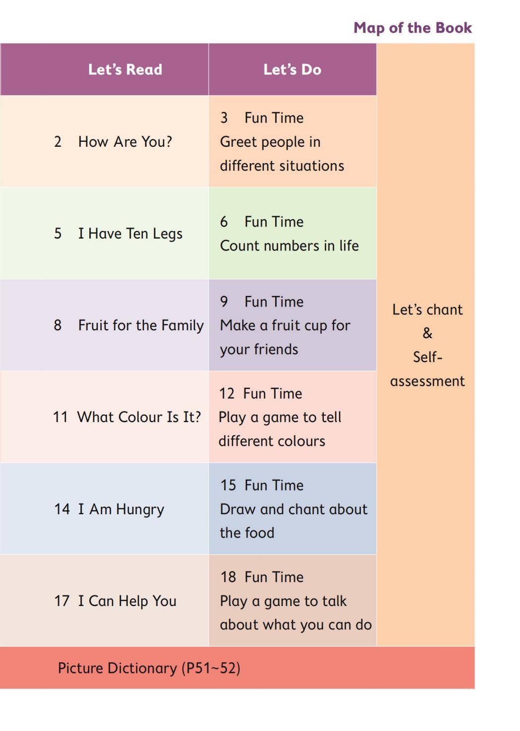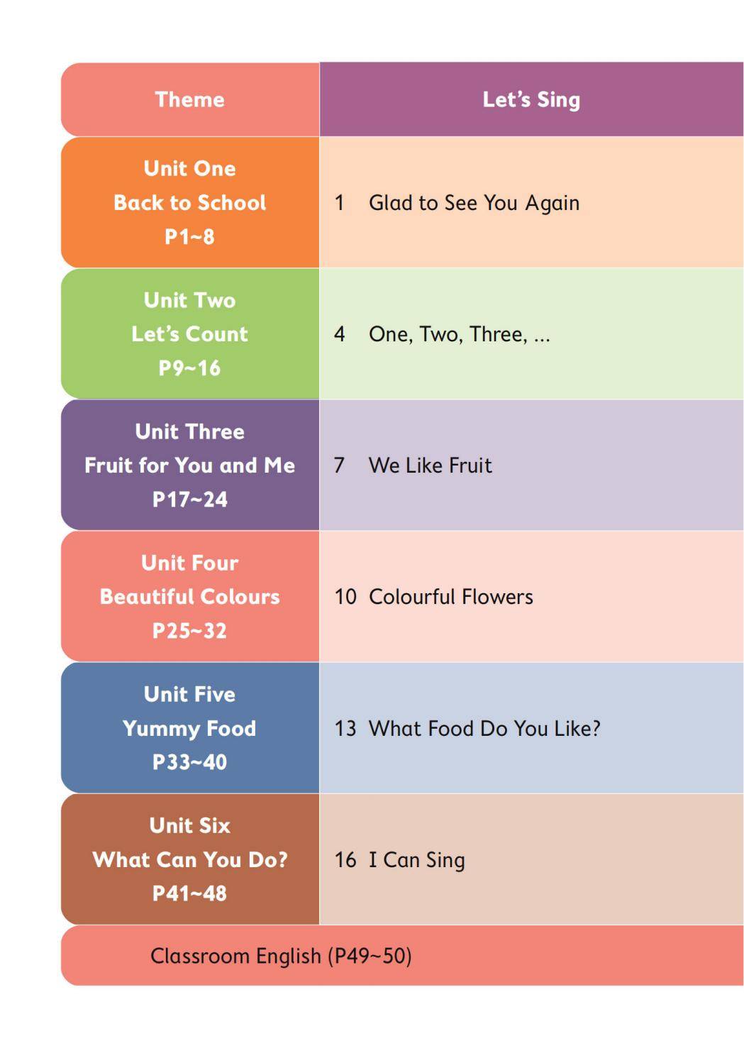每个单元的设计都围绕生活场景展开。“Let's Count” 教孩子数数,从 1 到 10,结合 “I Have Ten Legs” 这样的儿歌,把数字和身体部位联系起来;“Fruit for You and Me” 用水果主题,让孩子学会 “apple”“banana”,还能动手做水果杯送给朋友;“Beautiful Colours” 则通过游戏辨认颜色,“red”“yellow”“blue” 在玩中学得更快。