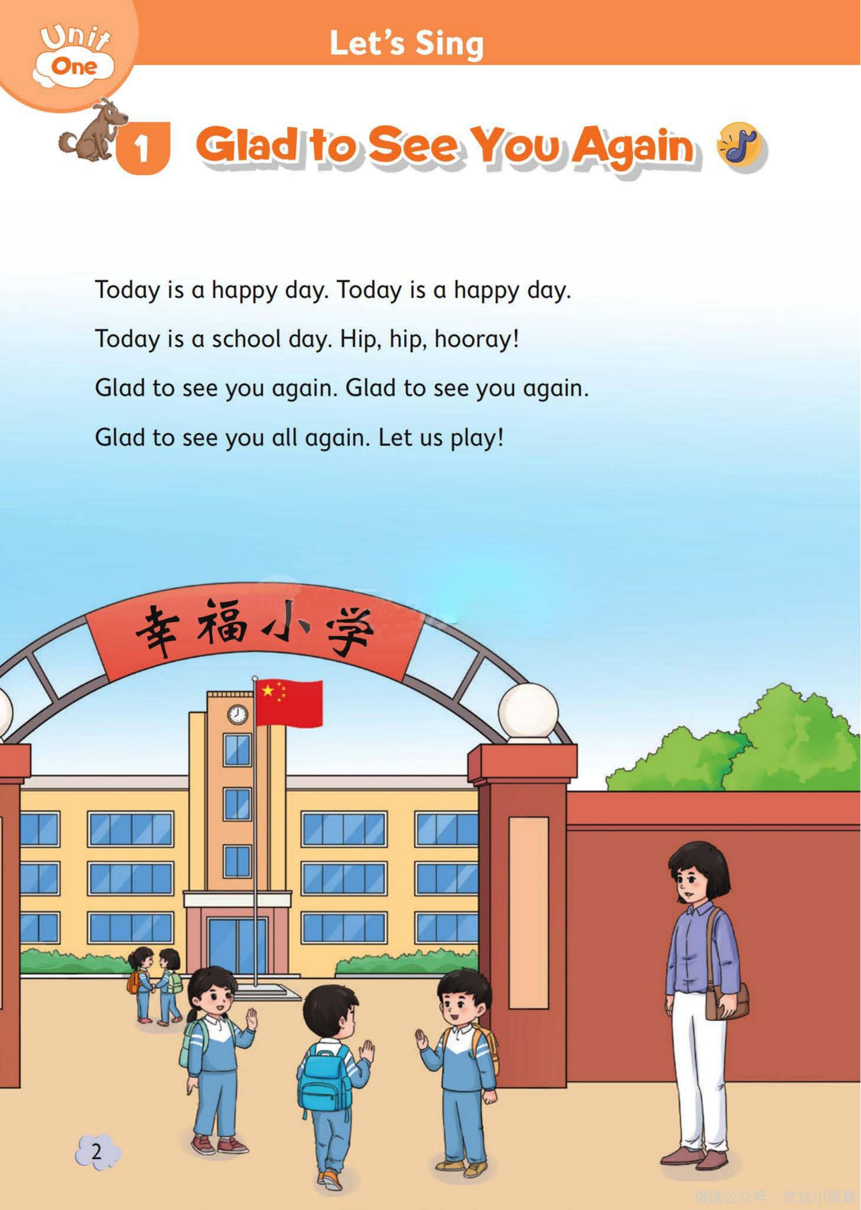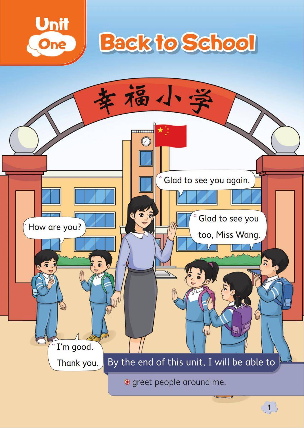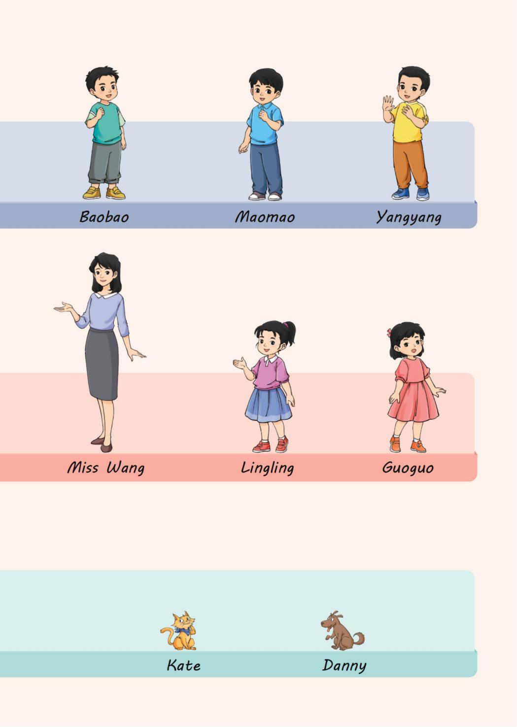 课本的主角是 Baobao、Guoguo、Lingling 几个熟悉的小伙伴,还有 Miss Wang 和可爱的小动物 Kate、Danny。从第一单元 “Back to School” 开始,孩子跟着歌曲《Glad to See You Again》练习问候语,“How are you?”“Glad to see you again” 这些句子,配上活泼的旋律,很快就能脱口而出。
