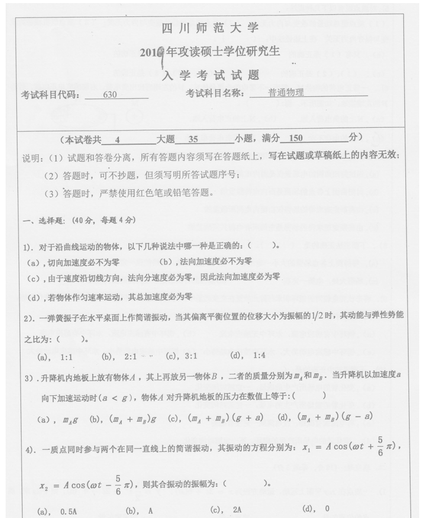2012-2019年四川师范大学830普通物理考研真题试卷【没有答案】