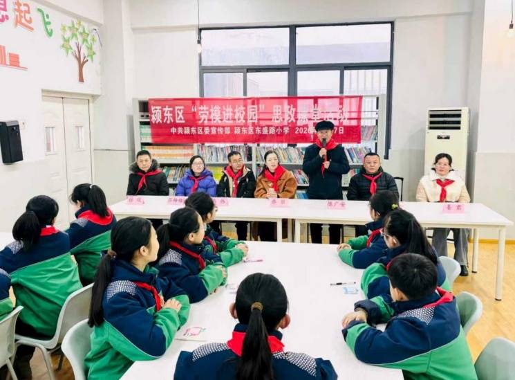 为深入学习身边榜样事迹,加强青少年思想道德建设与全民国防教育,1月27日,颍东区委宣传部在东盛路小学教育集团成功举办了一场别开生面的“学习身边榜样,争做颍东好少年”沉浸式思政教育文明实践活动。活动特邀“中国好人”陈广安与“阜阳好人”吕梅梅两位榜样人物走进校园,与少先队员代表围坐一堂,分享感人故事,传递奉献精神。