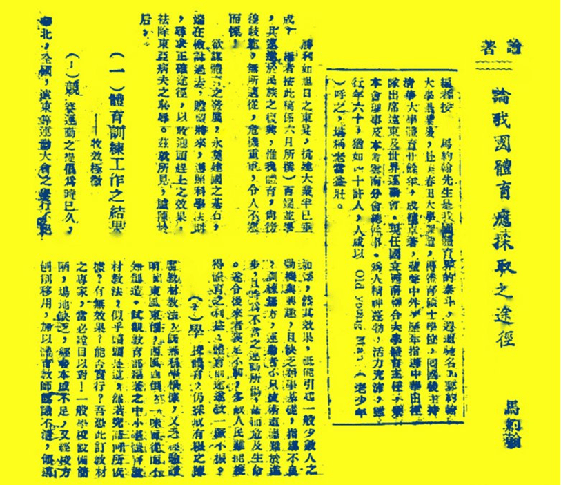 从内容上看,这篇撰于1945年的《论我国体育应采取之途径》与1946年发表的《在昆体育八年之回顾》密切相关,都可以看作是马约翰对抗战时期国民体育发展和教育实践的总结,对于研究其体育思想形成具有很大价值。