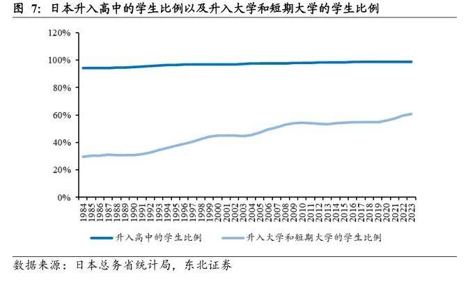 日本少子化三十年,初中生从2000年的410.4万人减少到2023年的322万人,减少了约21.5%。初中升高中的学生比例也从1984年的94.1%增长到2023年的98.7%。