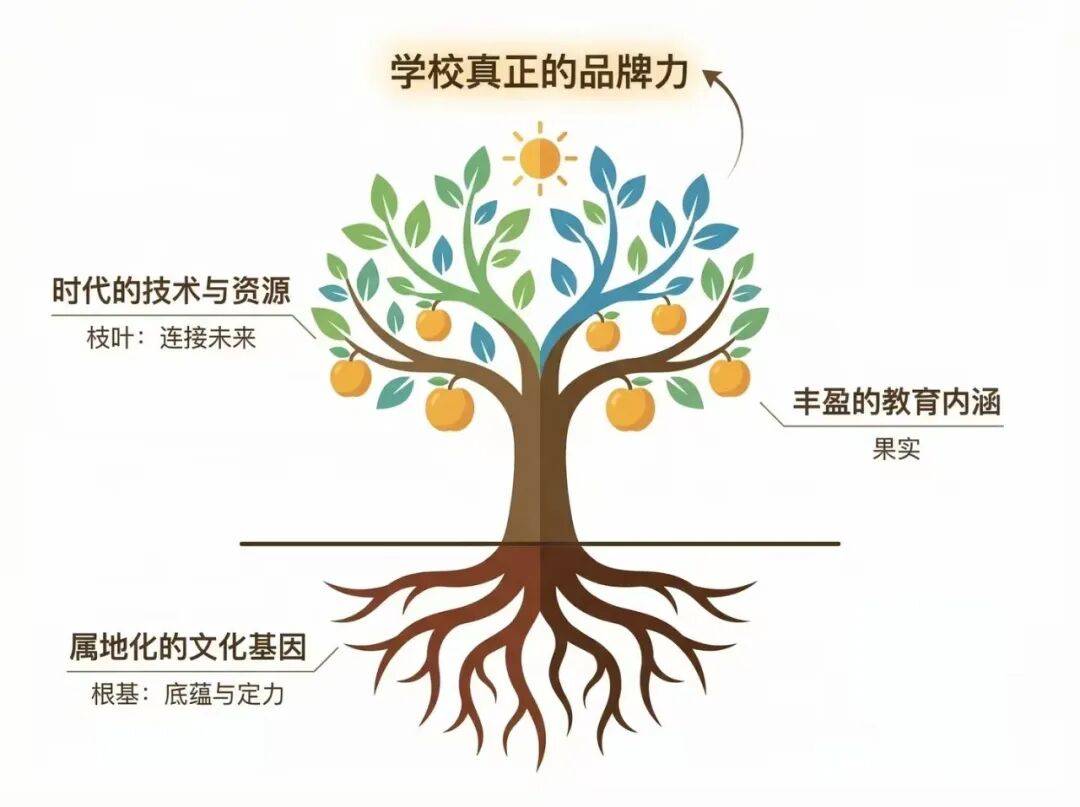 我们可以用一棵树来比喻这种理想的品牌形态:属地化的文化基因是深埋地下的“根基”,决定了学校的底蕴与定力;时代的技术与资源是向阳生长的“枝叶”,赋予了学校连接未来的能力;而最终结出的“果实”,则是丰盈的教育内涵。这三者的叠加效应,才构成了学校真正的品牌力。