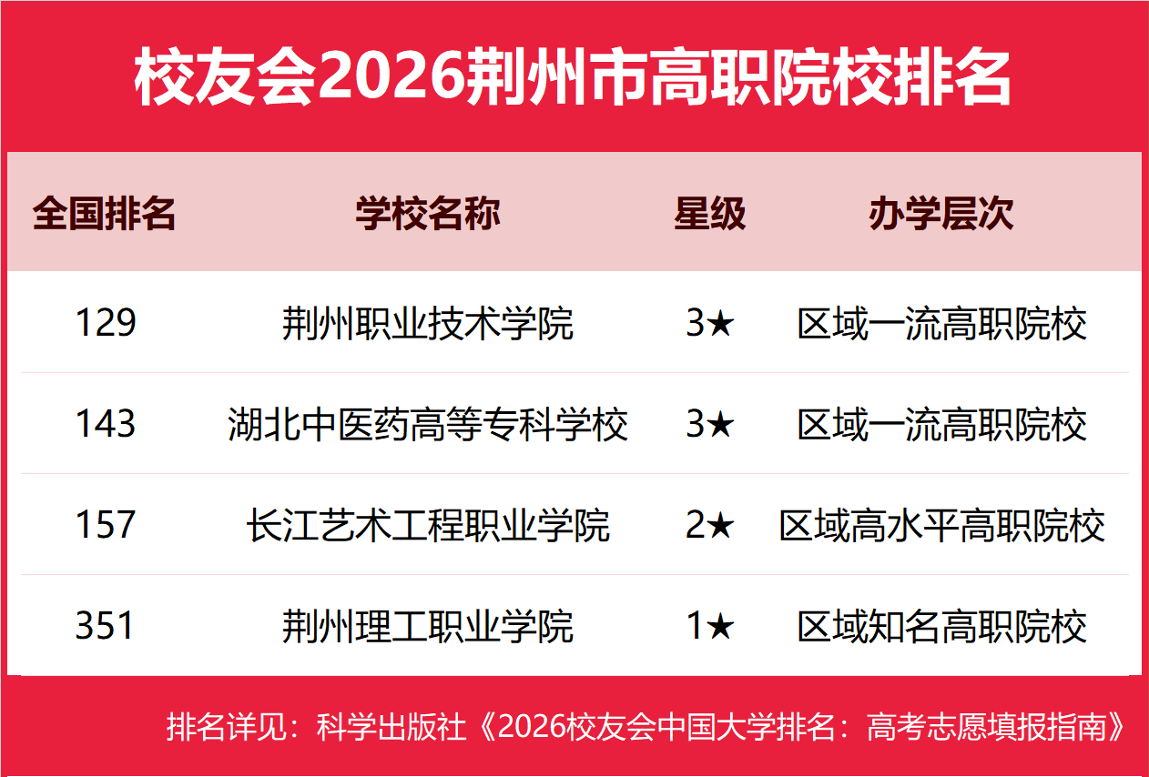 校友会2026荆州市高职院校排名,荆州职业技术学院第一,湖北中医药高等专科学校、长江艺术工程职业学院前三