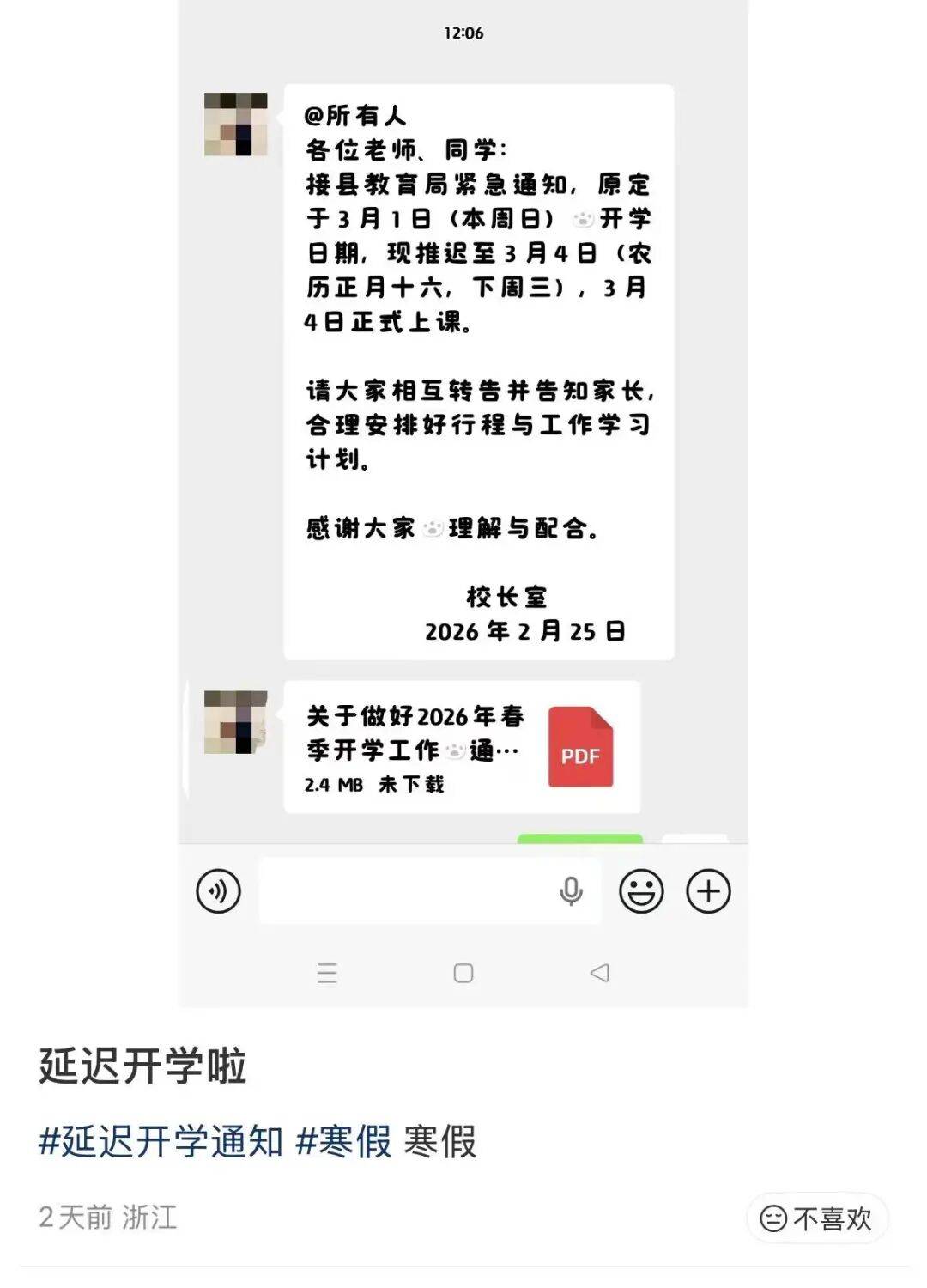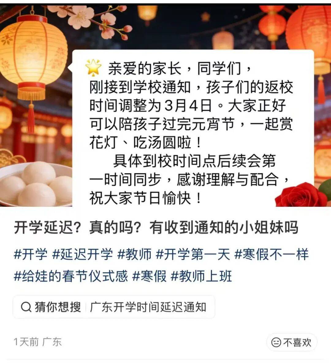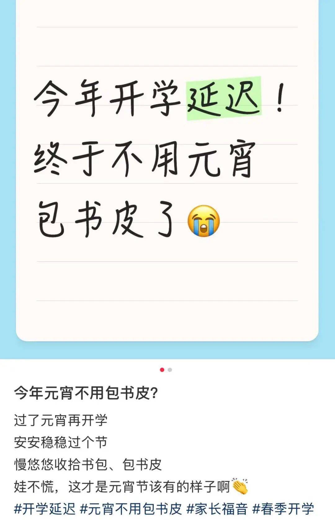 这里的延迟,主要是原定于元宵节前的开学推迟至节后开学。在相关帖子的评论区,一大批节前开学的网友纷纷表示羡慕,希望自己的学校也能紧随其上。